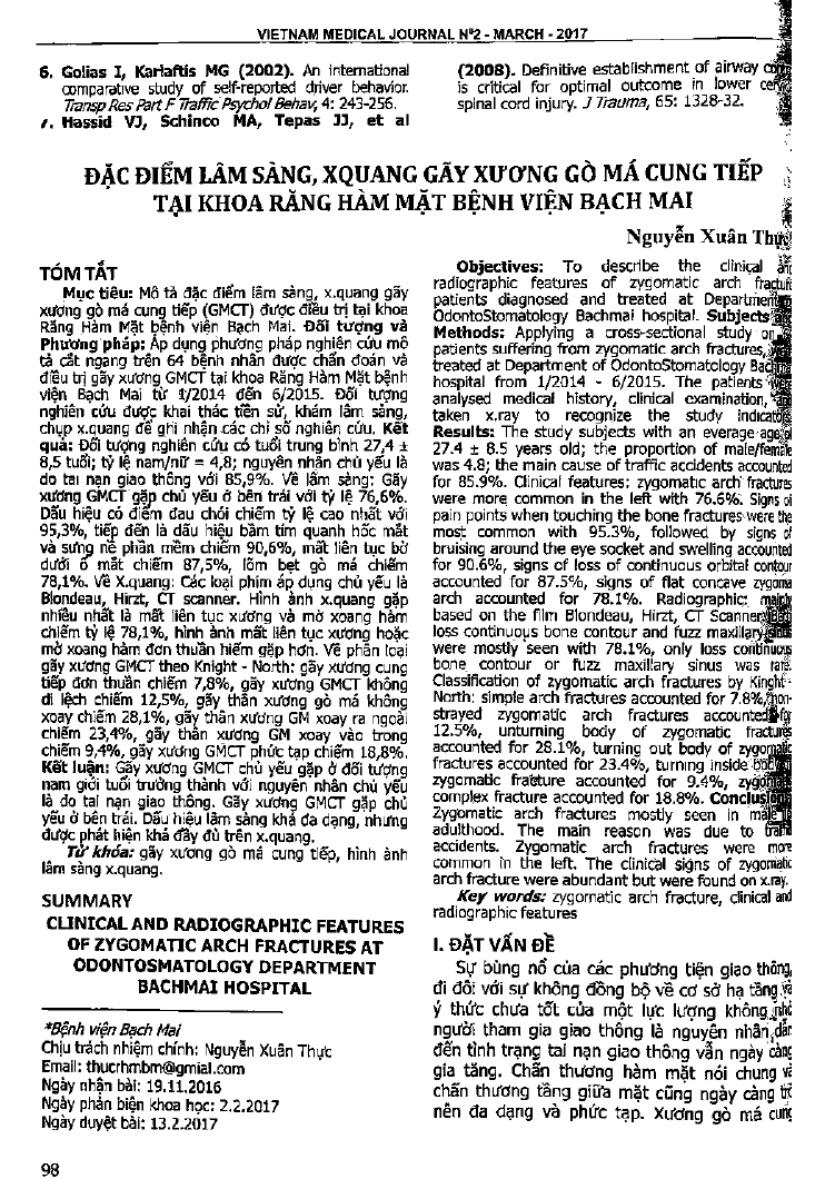 Mô tả đặc điểm lâm sàng, Xquang gãy xương gò má cung tiếp trên 64 bệnh nhân điều trị tại khoa Răng hàm mặt, bệnh viện Bạch Mai. Nghiên cứu cho thấy gãy xương gò má cung tiếp chủ yếu gặp ở đối tượng nam giới tuổi trưởng thành, nguyên nhân chính là tai nạn giao thông. Gãy xương gò má cung tiếp gặp chủ yếu ở bên trái. Dấu hiệu lâm sàng khá đa dạng, nhưng được phát hiện khá đầy đủ trên phim chụp Xquang.