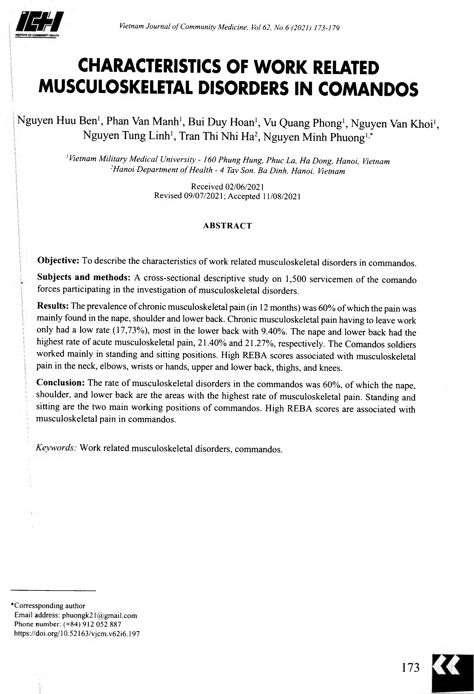 Mô tả đặc điểm rối loạn cơ xương nghề nghiệp ở bộ đội đặc công. Nghiên cứu mô tả cắt ngang trên 1.500 quân nhân thuộc binh chủng đặc công tham gia điều tra tình trạng rối loạn cơ xương. Tỷ lệ đau mỏi cơ xương mạn tính (trong 12 tháng) là 60% chủ yếu gặp ở vùng gáy, bả vai và nửa dưới lưng. Đau mỏi cơ xương mạn tính phải nghỉ việc chỉ có tỷ lệ thấp (17,73%), nhiều nhất là vùng nửa dưới lưng với 9,40%. Vùng gáy và nửa dưới lưng có tỷ lệ đau mỏi cơ xương cấp tính chiếm tỷ lệ cao nhất, lần lượt là 21,40% và 21,27%. Chủ yếu bộ đội Đặc công lao động trong tư thế đứng và ngồi. Điểm REBA cao liên quan đến đau mỏi cơ xương ở vùng gáy, khuỷu tay, cổ tay hoặc bàn tay, nửa trên, nửa dưới lưng, đùi và đầu gối. Tỷ lệ rối loạn cơ xương ở bộ đội đặc công là 60%, trong đó vùng gáy, vai, nửa dưới lưng là những vùng có tỷ lệ đau mỏi cơ xương chủ. Đứng và ngồi là hai tư thế lao động chủ yếu của bộ đội Đặc công. Điểm REBA cao có liên quan đến đau mỏi cơ xương ở bộ đội Đặc công.