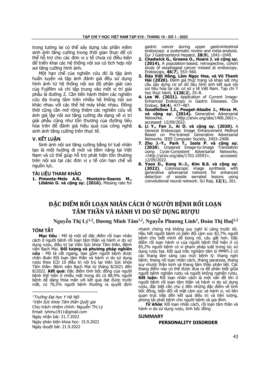 Describe characteristics of personality disorders in patients with mental and behavioral disorders due to use of alcohol, treated at the National Institute of Mental Health, Bach Mai Hospital. Subjects and research methods: Cross-sectional description of inpatients at the National Institute of Mental Health - Bach Mai Hospital from August 2021 to August 2022 diagnosed with Mental and behavioral disorders due to use of alcohol according to ICD 10. Results: The patient's impulsiveness is reflected in many aspects. In the patient group, 88,9% showed characteristics of being easily satisfied with short term goals, 76,5% often make spontaneous decisions without forethoughts. Most of the patients had emotional changes, 82,7% of the patients said they were more explosive and irritable. The characteristics of the patient's behavior disturbance were shown as 85,2% of the patients violating the law while using alcohol. The results of the MMPI-2 psychometric test showed high score at disorder level in the following clinical scales: hypochondriasis, personality disorder, paranoia, psychasthenia and schizophrenia scale. These scales can be used to differentiate between alcoholics and non-alcoholics. Conclusion: Personality disorders are a major problem in patients with mental and behavioral disorders due to use of alcohol, special attention should be paid to characteristics of impulsivity, emotional and behavioral alteration, as they are directly related to treatment results, prognosis and prevention of recurrence for the patients and their families.