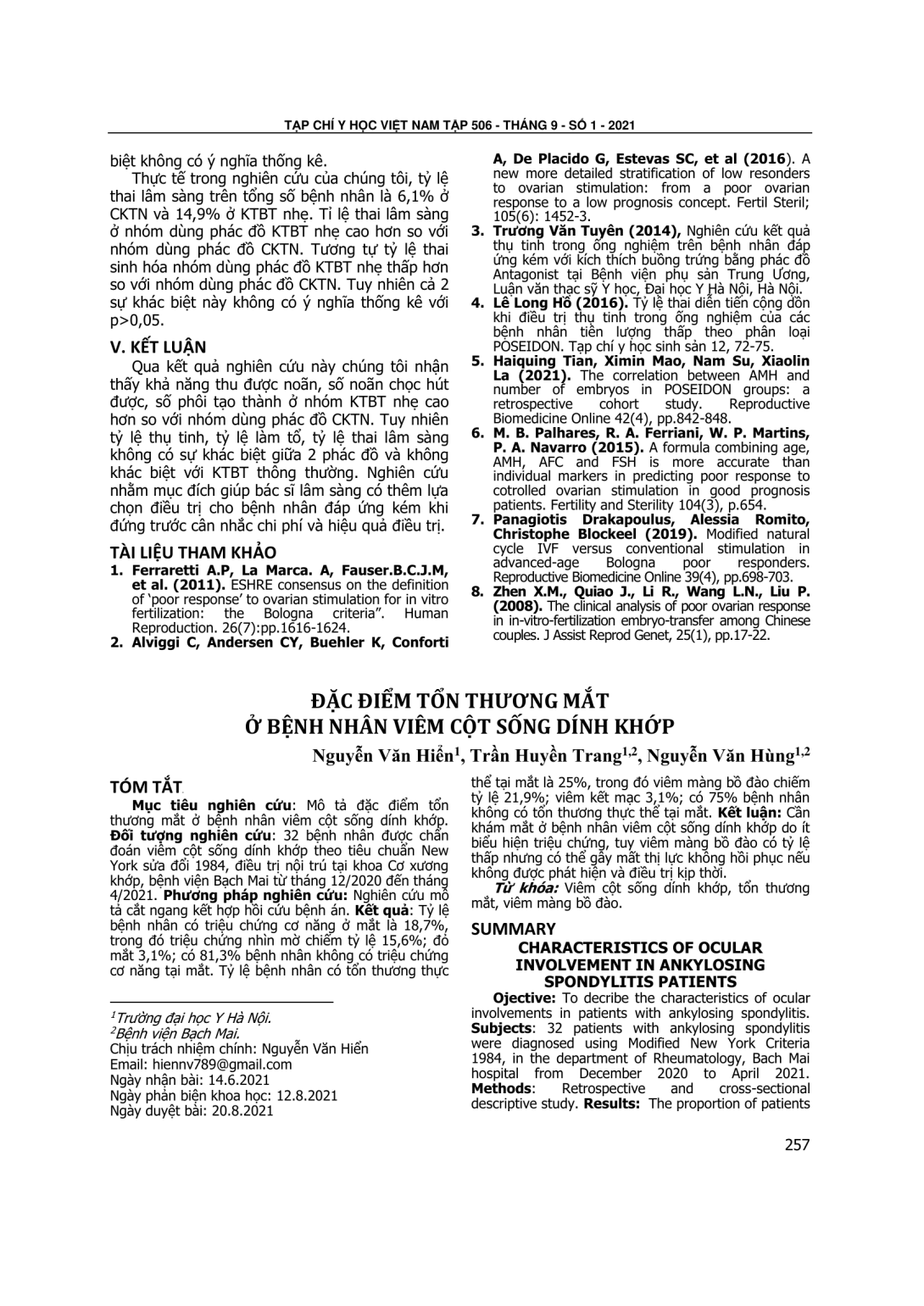 Mô tả đặc điểm tổn thương mắt ở bệnh nhân viêm cột sống dính khớp. Đối tượng nghiên cứu: 32 bệnh nhân được chẩn đoán viêm cột sống dính khớp theo tiêu chuẩn New York sửa đổi 1984, điều trị nội trú tại khoa Cơ xương khớp, bệnh viện Bạch Mai từ tháng 12/2020 đến tháng 4/2021. Phương pháp nghiên cứu: Nghiên cứu mô tả cắt ngang kết hợp hồi cứu bệnh án. Kết quả: Tỷ lệ bệnh nhân có triệu chứng cơ năng ở mắt là 18,7%, trong đó triệu chứng nhìn mờ chiếm tỷ lệ 15,6%; đỏ mắt 3,1%; có 81,3% bệnh nhân không có triệu chứng cơ năng tại mắt. Tỷ lệ bệnh nhân có tổn thương thực thể tại mắt là 25%, trong đó viêm màng bồ đào chiếm tỷ lệ 21,9%; viêm kết mạc 3,1%; có 75% bệnh nhân không có tổn thương thực thể tại mắt. Kết luận: Cần khám mắt ở bệnh nhân viêm cột sống dính khớp do ít biểu hiện triệu chứng, tuy viêm màng bồ đào có tỷ lệ thấp nhưng có thể gây mất thị lực không hồi phục nếu không được phát hiện và điều trị kịp thời.
