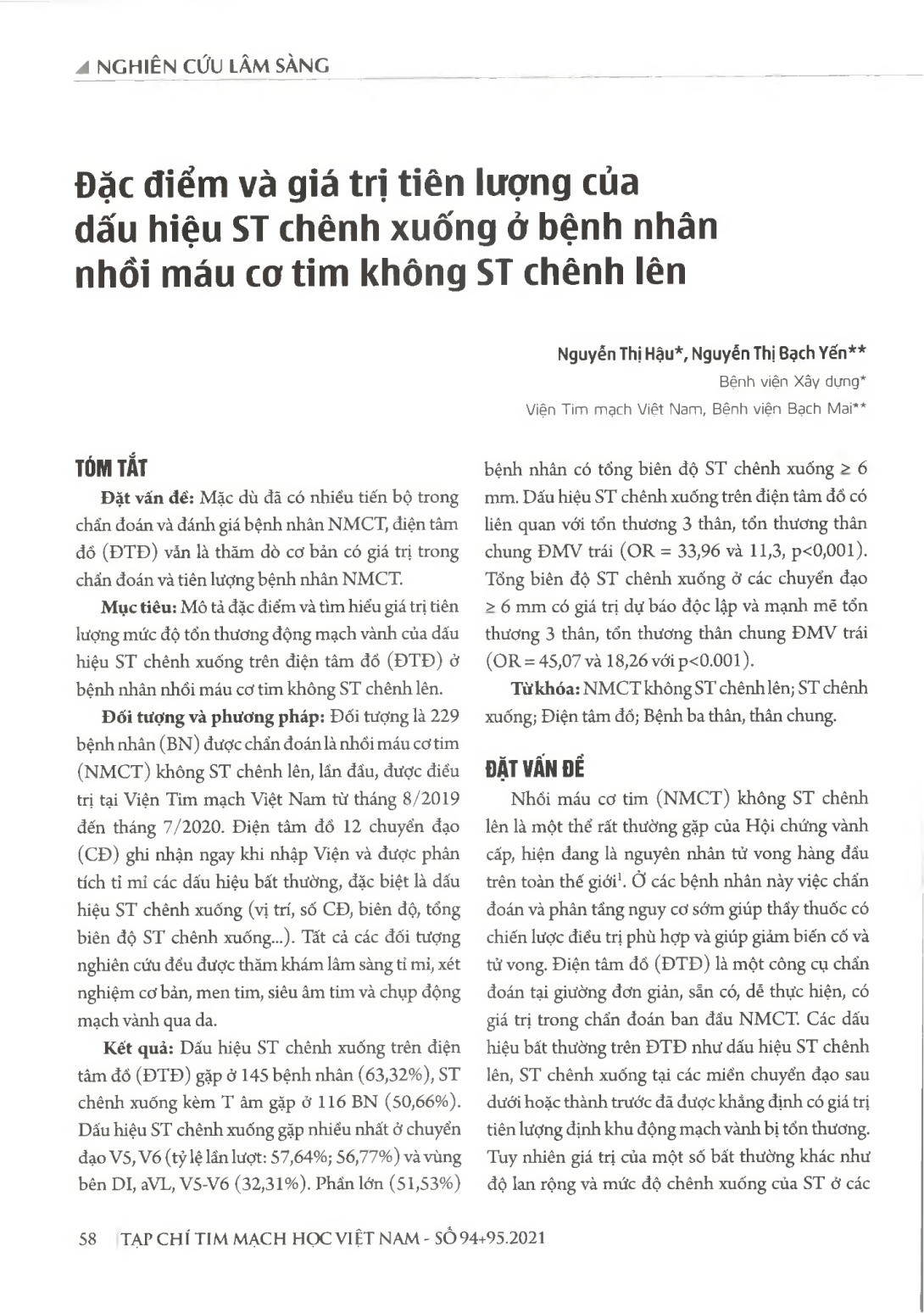Mô tả đặc điểm và tìm hiểu giá trị tiên lượng mức độ tổn thương động mạch vành của dấu hiệu ST chênh xuống trên điện tầm đồ (ĐTĐ) ở bệnh nhân nhồi máu cơ tim không ST chênh lên. Dấu hiệu ST chênh xuống trên điện tâm đó (ĐTĐ) gặp ở 145 bệnh nhân (63,32%), ST chênh xuống kèm T âm gặp ở 116 BN (50,66%). Dấu hiệu ST chênh xuống gặp nhiều nhất ở chuyển đạo V5,V6 (tỷ lệ lân lượt: 57,64%; 56,77%) và vùng bên DI, aVL, V5-V6 (32,31%). Phấn lớn (51,53%) bệnh nhân có tổng biên độ ST chênh xuống > 6 mm. Dấu hiệu ST chênh xuống trên điện tâm đổ có liên quan với tổn thương 3 thân, tổn thương thân chung ĐMV trái (OR = 33,96 và 11,3, p<0,001). Tổng biên độ ST chênh xuống ở các chuyển đạo > 6 mm có giá trị dự báo độc lập và mạnh mẽ tổn thương 3 thân, tổn thương thân chung ĐMV trái (OR = 45,07 và 18,26 với pcO.001).