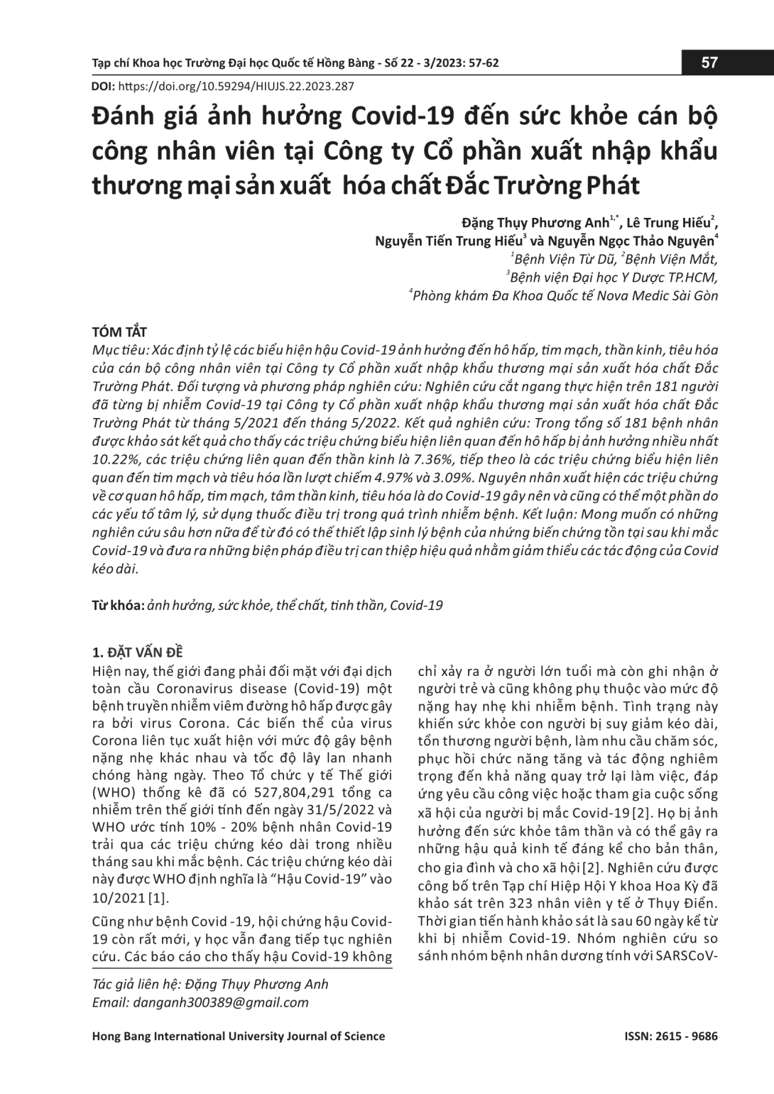 Xác định tỷ lệ các biểu hiện hậu Covid-19 ảnh hưởng đến hô hấp, tim mạch, thần kinh, tiêu hóa của cán bộ công nhân viên tại Công ty Cổ phần xuất nhập khẩu thương mại sản xuất hóa chất Đắc Trường Phát. Đối tượng và phương pháp nghiên cứu: Nghiên cứu cắt ngang thực hiện trên 181 người đã từng bị nhiễm Covid-19 tại Công ty Cổ phần xuất nhập khẩu thương mại sản xuất hóa chất Đắc Trường Phát từ tháng 5/2021 đến tháng 5/2022. Kết quả nghiên cứu: Trong tổng số 181 bệnh nhân được khảo sát kết quả cho thấy các triệu chứng biểu hiện liên quan đến hô hấp bị ảnh hưởng nhiều nhất 10.22%, các triệu chứng liên quan đến thần kinh là 7.36%, tiếp theo là các triệu chứng biểu hiện liên quan đến tim mạch và tiêu hóa lần lượt chiếm 4.97% và 3.09%. Nguyên nhân xuất hiện các triệu chứng về cơ quan hô hấp, tim mạch, tâm thần kinh, tiêu hóa là do Covid-19 gây nên và cũng có thể một phần do các yếu tố tâm lý, sử dụng thuốc điều trị trong quá trình nhiễm bệnh. Kết luận: Mong muốn có những nghiên cứu sâu hơn nữa để từ đó có thế thiết lập sinh lý bệnh của nhứng biến chứng tồn tại sau khi mắc Covid-19 và đưa ra những biện pháp điều trị can thiệp hiệu quả nhằm giảm thiểu các tác động của Covid kéo dài.