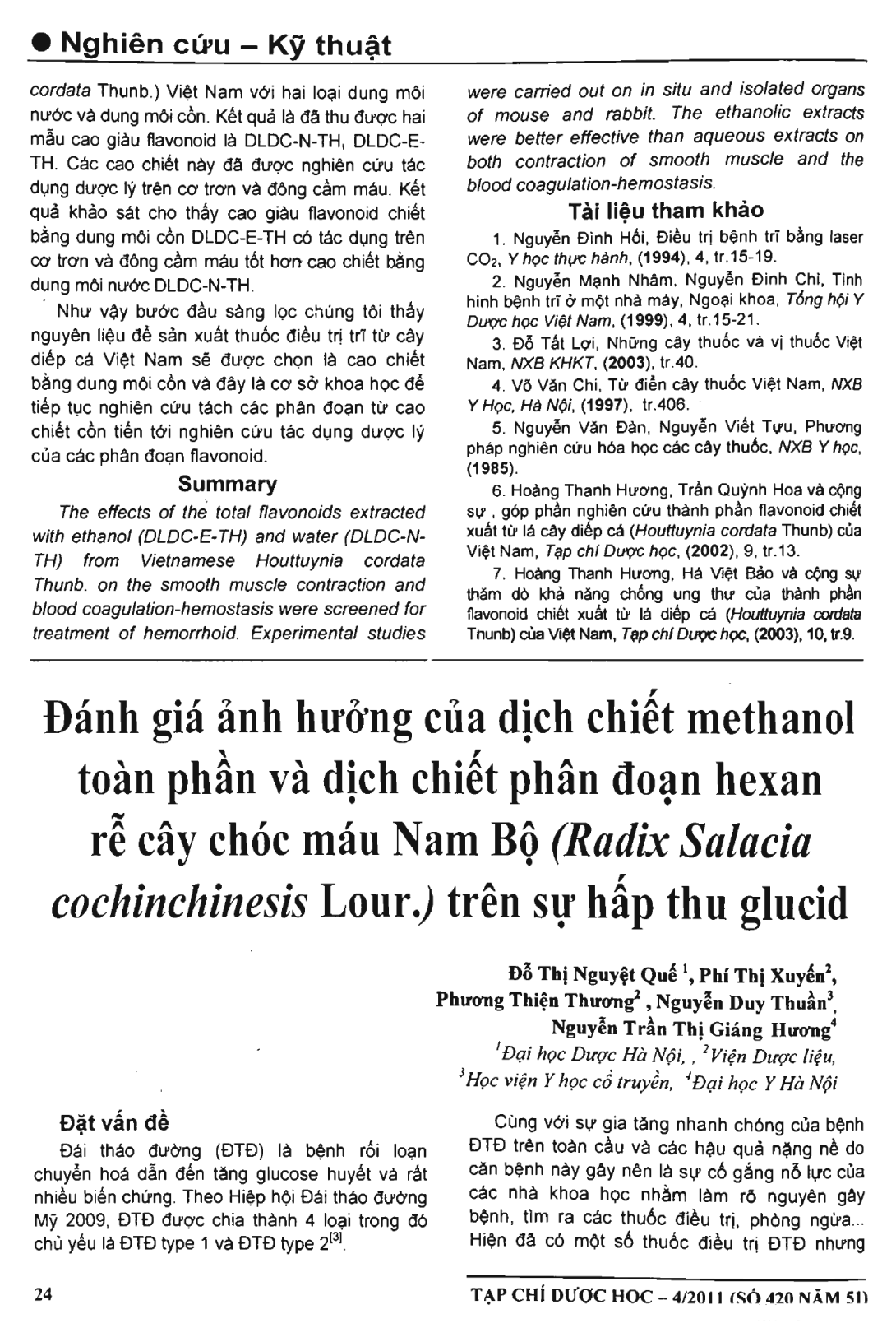 Đánh giá ảnh hưởng của dịch chiết methanoi toàn phần và dịch chiết phân đoạn hexan rễ cây chóc máu Nam Bộ (Radix Salacia cochinchinesis Lour.) trên sự hấp thu glucid