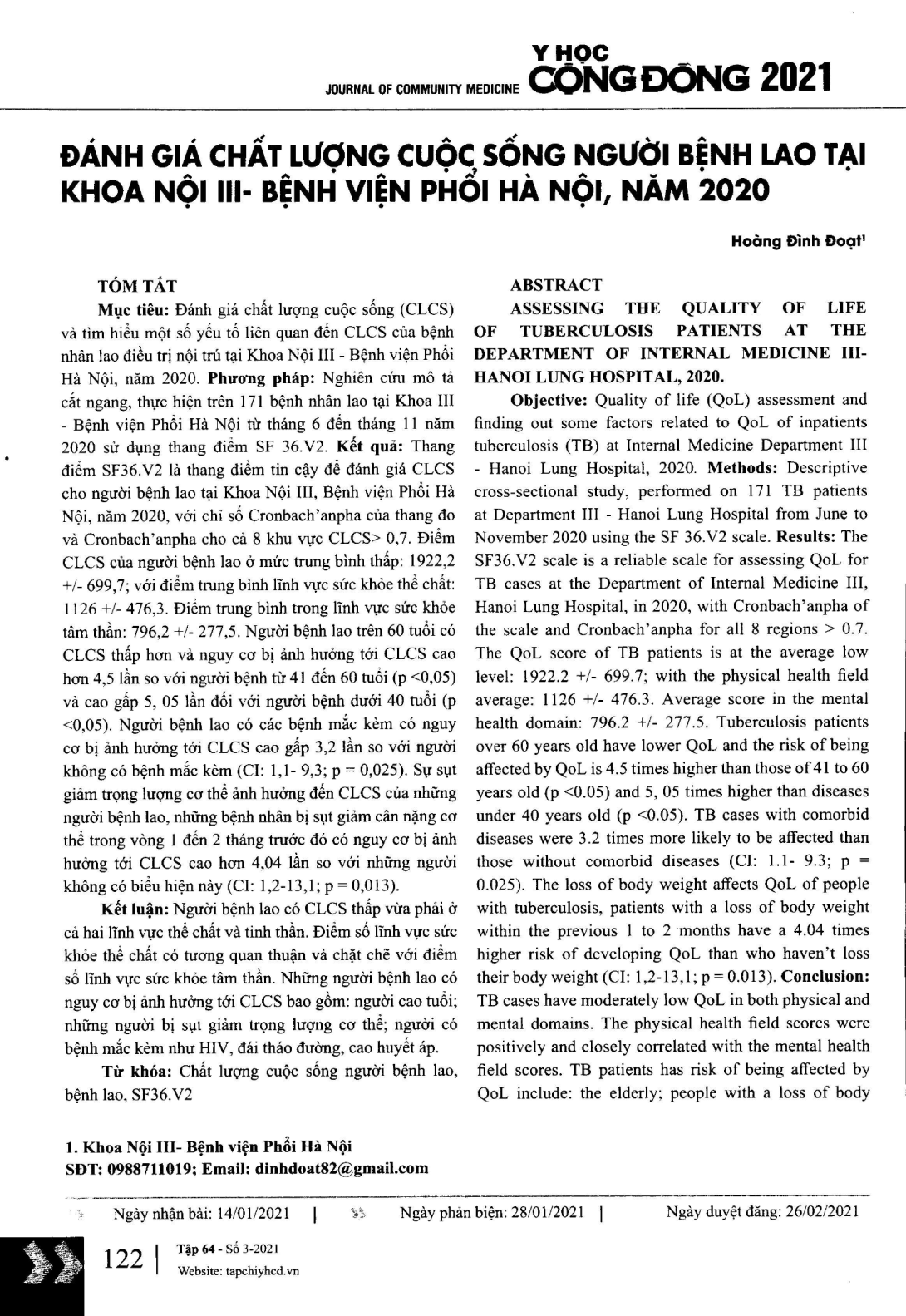 Quality of life (QoL) assessment and finding out some factors related to QoL of inpatients tuberculosis (TB) at Internal Medicine Department III - Hanoi Lung Hospital, 2020. Methods Descriptive cross-sectional study, performed on 171 TB patients at Department III - Hanoi Lung Hospital from June to November 2020 using the SF 36.V2 scale. Results The SF36.V2 scale is a reliable scale for assessing QoL for TB cases at the Department of Internal Medicine III, Hanoi Lung Hospital, in 2020, with Cronbach’anpha of the scale and Cronbach’anpha for all 8 regions > 0.7. The QoL score of TB patients is at the average low level 1922.2 +/- 699.7; with the physical health field average 1126 +/- 476.3. Average score in the mental health domain 796.2 +/- 277.5. Tuberculosis patients over 60 years old have lower QoL and the risk of being affected by QoL is 4.5 times higher than those of 41 to 60 years old (p <0.05) and 5, 05 times higher than diseases under 40 years old (p <0.05). TB cases with comorbid diseases were 3.2 times more likely to be affected than those without comorbid diseases (CI 1.1- 9.3; p = 0.025). The loss of body weight affects QoL of people with tuberculosis, patients with a loss of body weight within the previous 1 to 2 months have a 4.04 times higher risk of developing QoL than who haven’t loss their body weight (CI 1,2-13,1; p = 0.013). Conclusion TB cases have moderately low QoL in both physical and mental domains. The physical health field scores were positively and closely correlated with the mental health field scores. TB patients has risk of being affected by QoL include the elderly; people with a loss of body weight; people with comorbid diseases such as HIV, diabetes, high blood pressure.