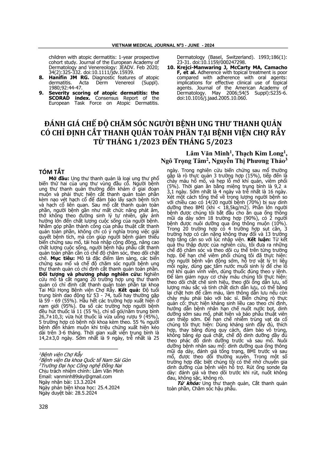 Describe clinical characteristics, postoperative complications and care regimens for patients with laryngeal cancer who are indicated for total laryngectomy. Materials and methods: A descriptive cross-sectional study of 20 cases of laryngeal cancer with indications for total laryngectomy at the Department of Otolaryngology, Cho Ray Hospital. Results: The average of age is from 53 to 74, the common age is 59 - 69 (55%). Most cases occur in men (95%). Most of the cases using cigarette 11 (55%), the average package index per year is 26.7±10.3 while smoking and drinking alcohol 9 (45%), 5 cases have other medical diseases. 55% of patients come to the clinic late when symptoms appear for more than 3-6 months. The average of hospital discharge time was 14.2+3.0 days, the earliest is 9 days, the latest is 25 days. In this study, the most common postoperative complications were esophageal fistula in 3 cases (15%), followed by bleeding from the incision, tracheostomy stenosis, and pneumonia (5%). The average of oral feeding time was 9.2 ± 3.1 days, the earliest is 4 days and the latest is 16 days. Considering the overall weight compared to the height of the patient, 14/20 patients (70%) were malnourished according to BMI (when < 18.5 kg/m2). Most of the patients are early started feeding through the nasogastric tube is 18 cases (90%), 2 patients is fed through the late nasogastric tube (10%). In 20 cases, there are 4 cases of weight loss, 3 cases of unchanged weight and 13 cases of weight gain compared to the time of admission. Conclusion: Esophageal cancer, Total laryngectomy, Postoperative care.