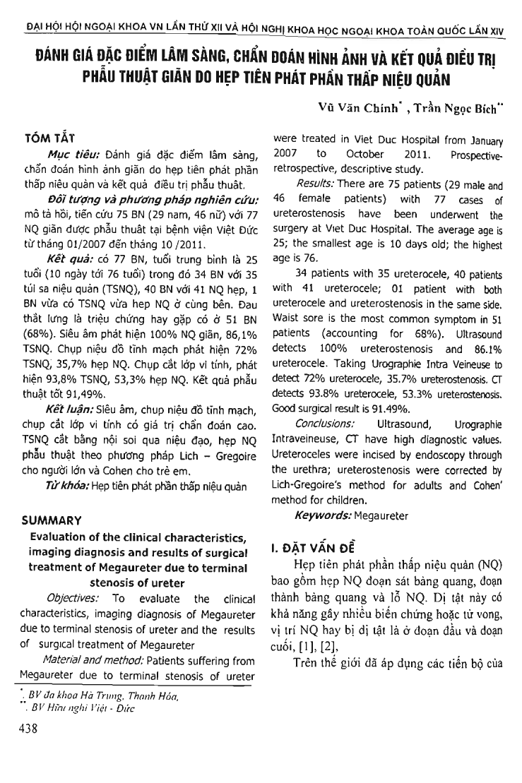 Objectives: To evaluate the clinical characteristics, imaging diagnosis of Megaureter due to terminal stenosis of ureter and the results of surgical treatment of Megaureter. Material and method: Patients suffering from Megaureter due to terminal stenosis of ureter were treated in Viet Duc Hospital from January 2007 to October 2011. Prospectiveretrospective, descriptive study. Results: There are 75 patients (29 male and 46 female patients) with 77 cases of ureterostenosis have been underwent the surgery at Viet Duc Hospital. The average age is 25; the smallest age is 10 days old; the highest age is 76. 34 patients with 35 ureterocele, 40 patients with 41 ureterocele; 01 patient with both ureterocele and ureterostenosis in the same side. Waist sore is the most common symptom in 51 patients (accounting for 68 percent). Ultrasound detects 100 percent ureterostenosis and 86.1 percent ureterocele. Taking Urographie Intra Veineuse to detect 72 percent ureterocele, 35.7 percent ureterostenosis. CT detects 93.8 percent ureterocele, 53.3 percent ureterostenosis. Good surgical result is 91.49 percent. Conclusions: Ultrasound, Urographie Intraveineuse, CT have high diagnostic values. Ureteroceles were incised by endoscopy through the urethra; ureterostenosis were corrected by Lich-Gregoire's method for adults and Cohen' method for children.