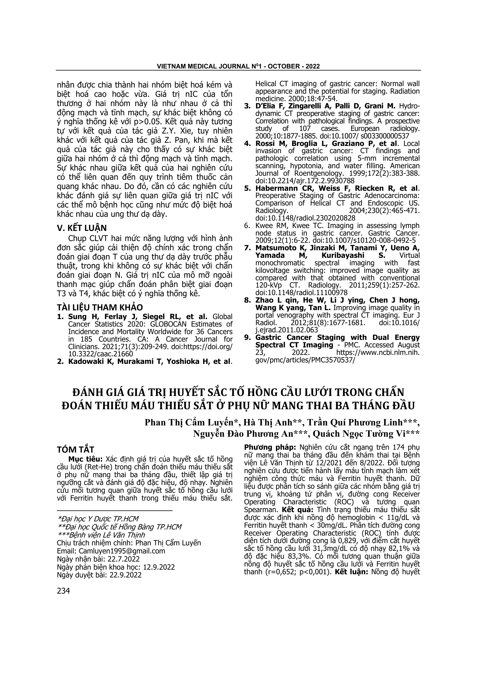 Xác định giá trị của huyết sắc tố hồng cầu lưới (Ret-He) trong chẩn đoán thiếu máu thiếu sắt ở phụ nữ mang thai ba tháng đầu, thiết lập giá trị ngưỡng cắt và đánh giá độ đặc hiệu, độ nhạy. Nghiên cứu mối tương quan giữa huyết sắc tố hồng cầu lưới với Ferritin huyết thanh trong thiếu máu thiếu sắt. Nghiên cứu cắt ngang trên 174 phụ nữ mang thai ba tháng đầu đến khám thai tại Bệnh viện Lê Văn Thịnh từ 12/2021 đến 8/2022. Đối tượng nghiên cứu được tiến hành lấy máu tĩnh mạch làm xét nghiệm công thức máu và Ferritin huyết thanh. Dữ liệu được phân tích so sánh giữa các nhóm bằng giá trị trung vị, khoảng tứ phân vị, đường cong Receiver Operating Characteristic (ROC) và tương quan Spearman. Kết quả: Tình trạng thiếu máu thiếu sắt được xác định khi nồng độ hemoglobin < 11g/dL và Ferritin huyết thanh < 30mg/dL. Phân tích đường cong Receiver Operating Characteristic (ROC) tính được diện tích dưới đường cong là 0,829, với điểm cắt huyết sắc tố hồng cầu lưới 31,3mg/dL có độ nhạy 82,1% và độ đặc hiệu 83,3%. Có mối tương quan thuận giữa nồng độ huyết sắc tố hồng cầu lưới và Ferritin huyết thanh (r=0,652; p<0,001). Kết luận: Nồng độ huyết sắc tố hồng cầu lưới là một chỉ dấu tốt hỗ trợ chẩn đoán sớm thiếu máu thiếu sắt ở phụ nữ mang thai ba tháng đầu. Ngoài ra, nồng độ huyết sắt tố hồng cầu lưới có thể dự báo tốt trong đánh giá lượng sắt dự trữ tại tủy xương thông qua mối tương quan thuận với Ferritin huyết thanh.