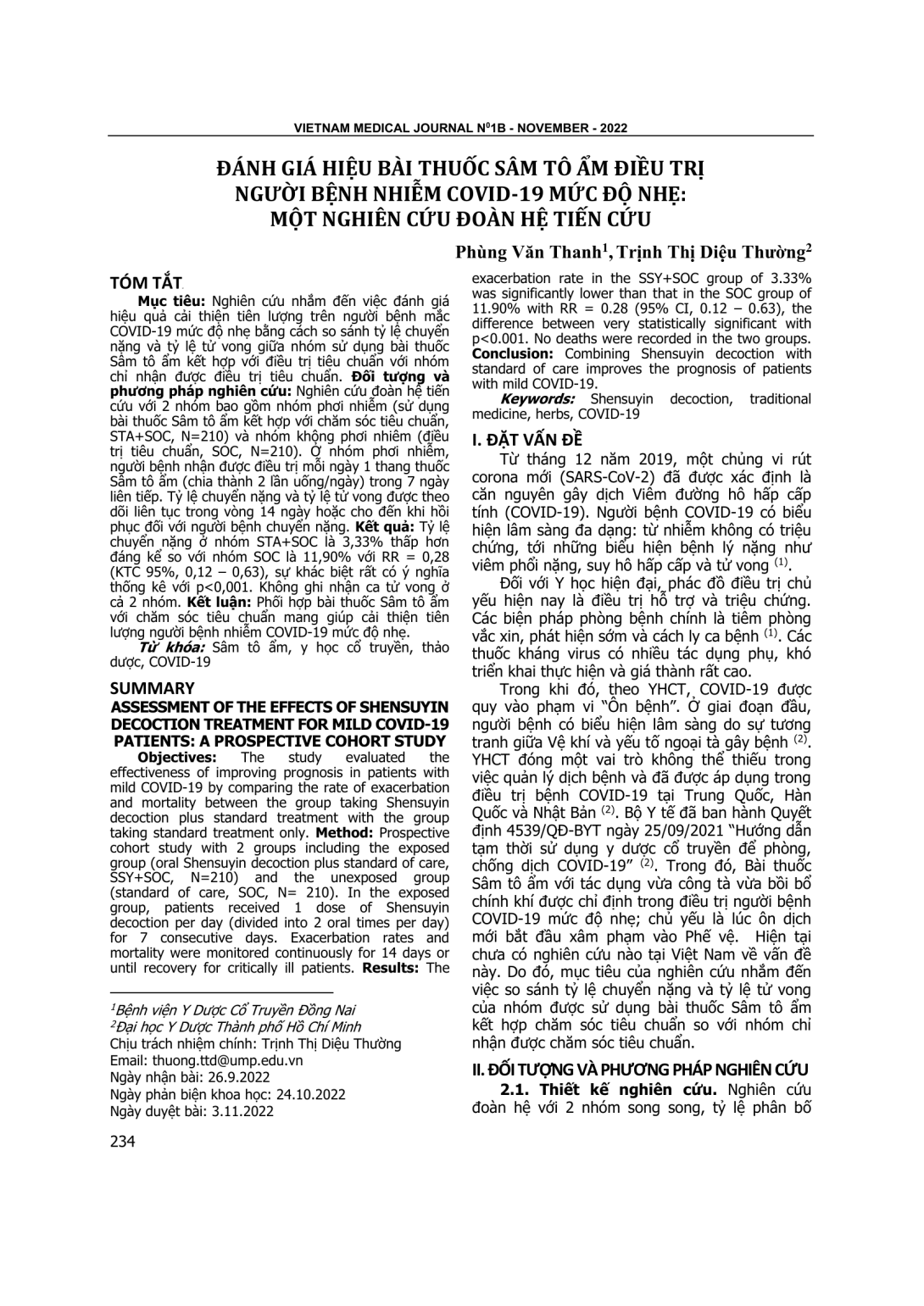 Nghiên cứu nhắm đến việc đánh giá hiệu quả cải thiện tiên lượng trên người bệnh mắc COVID-19 mức độ nhẹ bằng cách so sánh tỷ lệ chuyển nặng và tỷ lệ tử vong giữa nhóm sử dụng bài thuốc Sâm tô ẩm kết hợp với điều trị tiêu chuẩn với nhóm chỉ nhận được điều trị tiêu chuẩn. Đối tượng và phương pháp nghiên cứu: Nghiên cứu đoàn hệ tiến cứu với 2 nhóm bao gồm nhóm phơi nhiễm (sử dụng bài thuốc Sâm tô ẩm kết hợp với chăm sóc tiêu chuẩn, STA+SOC, N=210) và nhóm không phơi nhiêm (điều trị tiêu chuẩn, SOC, N=210). Ở nhóm phơi nhiễm, người bệnh nhận được điều trị mỗi ngày 1 thang thuốc Sâm tô ẩm (chia thành 2 lần uống/ngày) trong 7 ngày liên tiếp. Tỷ lệ chuyển nặng và tỷ lệ tử vong được theo dõi liên tục trong vòng 14 ngày hoặc cho đến khi hồi phục đối với người bệnh chuyển nặng. Kết quả: Tỷ lệ chuyển nặng ở nhóm STA+SOC là 3,33% thấp hơn đáng kể so với nhóm SOC là 11,90% với RR = 0,28 (KTC 95%, 0,12 – 0,63), sự khác biệt rất có ý nghĩa thống kê với p<0,001. Không ghi nhận ca tử vong ở cả 2 nhóm. Kết luận: Phối hợp bài thuốc Sâm tô ẩm với chăm sóc tiêu chuẩn mang giúp cải thiện tiên lượng người bệnh nhiễm COVID-19 mức độ nhẹ.