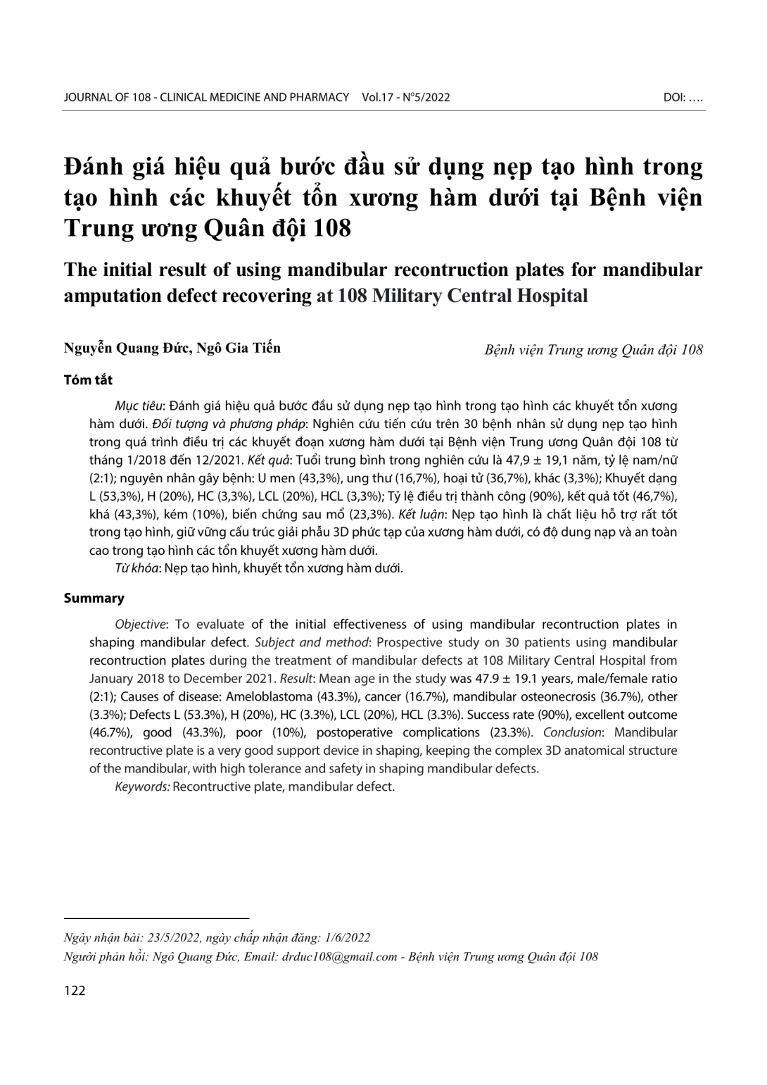 Đánh giá hiệu quả bước đầu sử dụng nẹp tạo hình trong tạo hình các khuyết tổn xương hàm dưới. Đối tượng và phương pháp: Nghiên cứu tiến cứu trên 30 bệnh nhân sử dụng nẹp tạo hình trong quá trình điều trị các khuyết đoạn xương hàm dưới tại Bệnh viện Trung ương Quân đội 108 từ tháng 1/2018 đến 12/2021. Kết quả: Tuổi trung bình trong nghiên cứu là 47,9 ± 19,1 năm, tỷ lệ nam/nữ (2:1); nguyên nhân gây bệnh: U men (43,3%), ung thư (16,7%), hoại tử (36,7%), khác (3,3%); Khuyết dạng L (53,3%), H (20%), HC (3,3%), LCL (20%), HCL (3,3%); Tỷ lệ điều trị thành công (90%), kết quả tốt (46,7%), khá (43,3%), kém (10%), biến chứng sau mổ (23,3%). Kết luận: Nẹp tạo hình là chất liệu hỗ trợ rất tốt trong tạo hình, giữ vững cấu trúc giải phẫu 3D phức tạp của xương hàm dưới, có độ dung nạp và an toàn cao trong tạo hình các tổn khuyết xương hàm dưới.