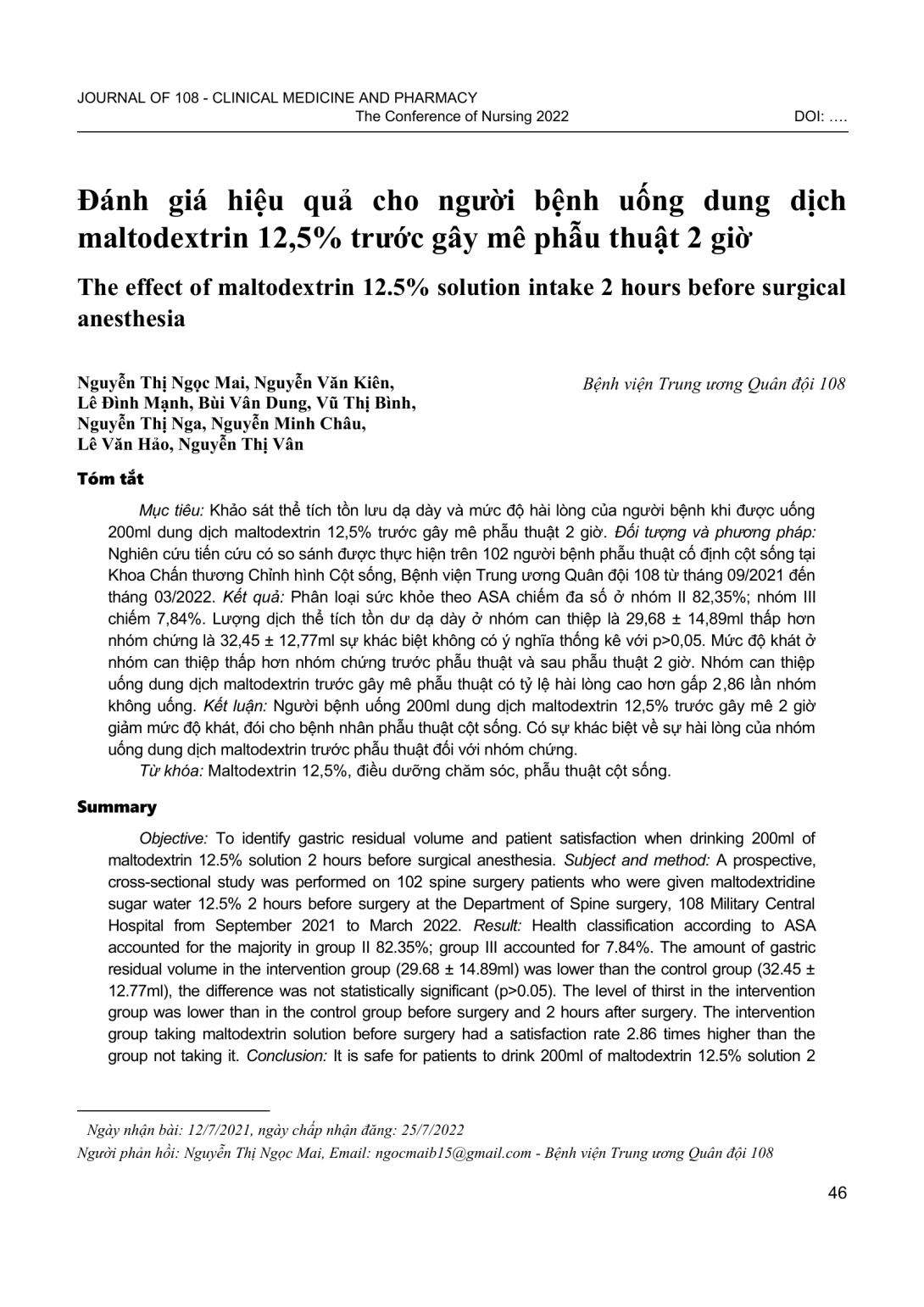 Khảo sát thể tích tồn lưu dạ dày và mức độ hài lòng của người bệnh khi được uống 200ml dung dịch maltodextrin 12,5% trước gây mê phẫu thuật 2 giờ. Đối tượng và phương pháp: Nghiên cứu tiến cứu có so sánh được thực hiện trên 102 người bệnh phẫu thuật cố định cột sống tại Khoa Chấn thương Chỉnh hình Cột sống, Bệnh viện Trung ương Quân đội 108 từ tháng 09/2021 đến tháng 03/2022. Kết quả: Phân loại sức khỏe theo ASA chiếm đa số ở nhóm II 82,35%; nhóm III chiếm 7,84%. Lượng dịch thể tích tồn dư dạ dày ở nhóm can thiệp là 29,68 ± 14,89ml thấp hơn nhóm chứng là 32,45 ± 12,77ml sự khác biệt không có ý nghĩa thống kê với p>0,05. Mức độ khát ở nhóm can thiệp thấp hơn nhóm chứng trước phẫu thuật và sau phẫu thuật 2 giờ. Nhóm can thiệp uống dung dịch maltodextrin trước gây mê phẫu thuật có tỷ lệ hài lòng cao hơn gấp 2,86 lần nhóm không uống. Kết luận: Người bệnh uống 200ml dung dịch maltodextrin 12,5% trước gây mê 2 giờ giảm mức độ khát, đói cho bệnh nhân phẫu thuật cột sống. Có sự khác biệt về sự hài lòng của nhóm uống dung dịch maltodextrin trước phẫu thuật đối với nhóm chứng.