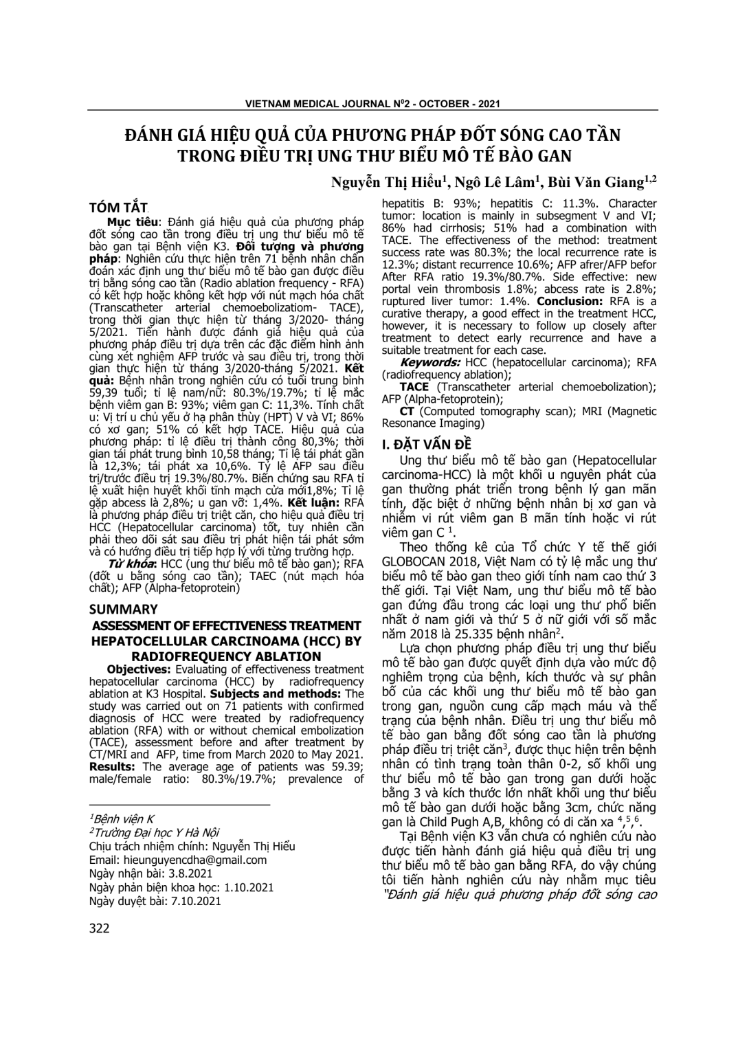 Đánh giá hiệu quả của phương pháp đốt sóng cao tần trong điều trị ung thư biểu mô tế bào gan tại Bệnh viện K3. Đối tượng và phương pháp: Nghiên cứu thực hiện trên 71 bệnh nhân chẩn đoán xác định ung thư biểu mô tế bào gan được điều trị bằng sóng cao tần (Radio ablation frequency - RFA) có kết hợp hoặc không kết hợp với nút mạch hóa chất (Transcatheter arterial chemoebolizatiom- TACE), trong thời gian thực hiện từ tháng 3/2020- tháng 5/2021. Tiến hành được đánh giá hiệu quả của phương pháp điều trị dựa trên các đặc điểm hình ảnh cùng xét nghiệm AFP trước và sau điều trị, trong thời gian thực hiện từ tháng 3/2020-tháng 5/2021. Kết quả: Bệnh nhân trong nghiên cứu có tuổi trung bình 59,39 tuổi; tỉ lệ nam/nữ: 80.3%/19.7%; tỉ lệ mắc bệnh viêm gan B: 93%; viêm gan C: 11,3%. Tính chất u: Vị trí u chủ yếu ở hạ phân thùy (HPT) V và VI; 86% có xơ gan; 51% có kết hợp TACE. Hiệu quả của phương pháp: tỉ lệ điều trị thành công 80,3%; thời gian tái phát trung bình 10,58 tháng; Tỉ lệ tái phát gần là 12,3%; tái phát xa 10,6%. Tỷ lệ AFP sau điều trị/trước điều trị 19.3%/80.7%. Biến chứng sau RFA tỉ lệ xuất hiện huyết khối tĩnh mạch cửa mới1,8%; Tỉ lệ gặp abcess là 2,8%; u gan vỡ: 1,4%. Kết luận: RFA là phương pháp điều trị triệt căn, cho hiệu quả điều trị HCC (Hepatocellular carcinoma) tốt, tuy nhiên cần phải theo dõi sát sau điều trị phát hiện tái phát sớm và có hướng điều trị tiếp hợp lý với từng trường hợp.