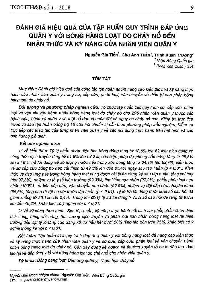Đánh giá hiệu quả của tập huấn quy trình đáp ứng quân y với bỏng hàng loạt do cháy nổ đến nhận thức và kỹ năng của nhân viên quân y