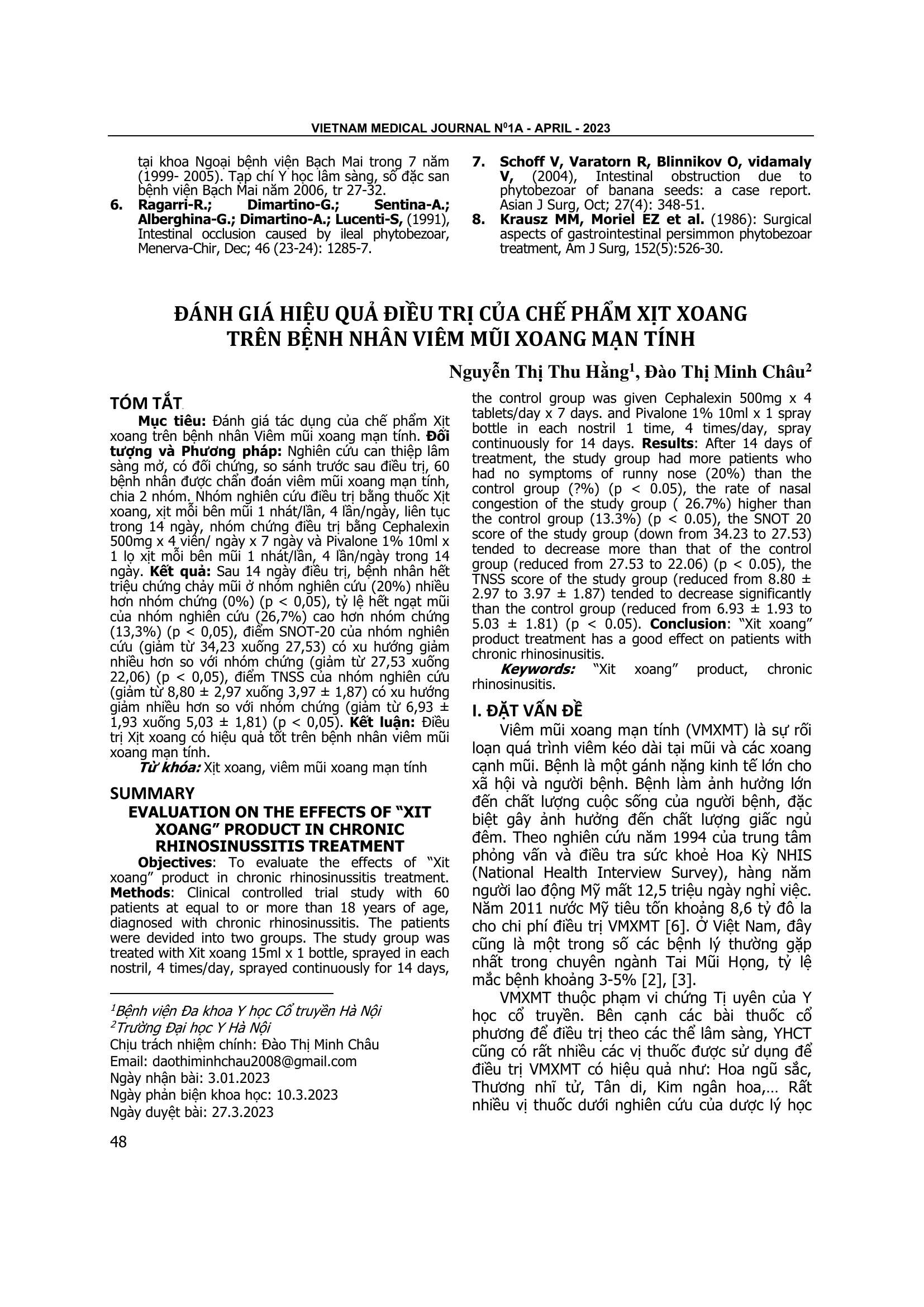 Đánh giá tác dụng của chế phẩm Xịt xoang trên bệnh nhân Viêm mũi xoang mạn tính. Đối tượng và Phương pháp: Nghiên cứu can thiệp lâm sàng mở, có đối chứng, so sánh trước sau điều trị, 60 bệnh nhân được chẩn đoán viêm mũi xoang mạn tính, chia 2 nhóm. Nhóm nghiên cứu điều trị bằng thuốc Xịt xoang, xịt mỗi bên mũi 1 nhát/lần, 4 lần/ngày, liên tục trong 14 ngày, nhóm chứng điều trị bằng Cephalexin 500mg x 4 viên/ ngày x 7 ngày và Pivalone 1% 10ml x 1 lọ xịt mỗi bên mũi 1 nhát/lần, 4 lần/ngày trong 14 ngày. Kết quả: Sau 14 ngày điều trị, bệnh nhân hết triệu chứng chảy mũi ở nhóm nghiên cứu (20%) nhiều hơn nhóm chứng (0%) (p < 0,05), tỷ lệ hết ngạt mũi của nhóm nghiên cứu (26,7%) cao hơn nhóm chứng (13,3%) (p < 0,05), điểm SNOT-20 của nhóm nghiên cứu (giảm từ 34,23 xuống 27,53) có xu hướng giảm nhiều hơn so với nhóm chứng (giảm từ 27,53 xuống 22,06) (p < 0,05), điểm TNSS của nhóm nghiên cứu (giảm từ 8,80 ± 2,97 xuống 3,97 ± 1,87) có xu hướng giảm nhiều hơn so với nhóm chứng (giảm từ 6,93 ± 1,93 xuống 5,03 ± 1,81) (p < 0,05). Kết luận: Điều trị Xịt xoang có hiệu quả tốt trên bệnh nhân viêm mũi xoang mạn tính.