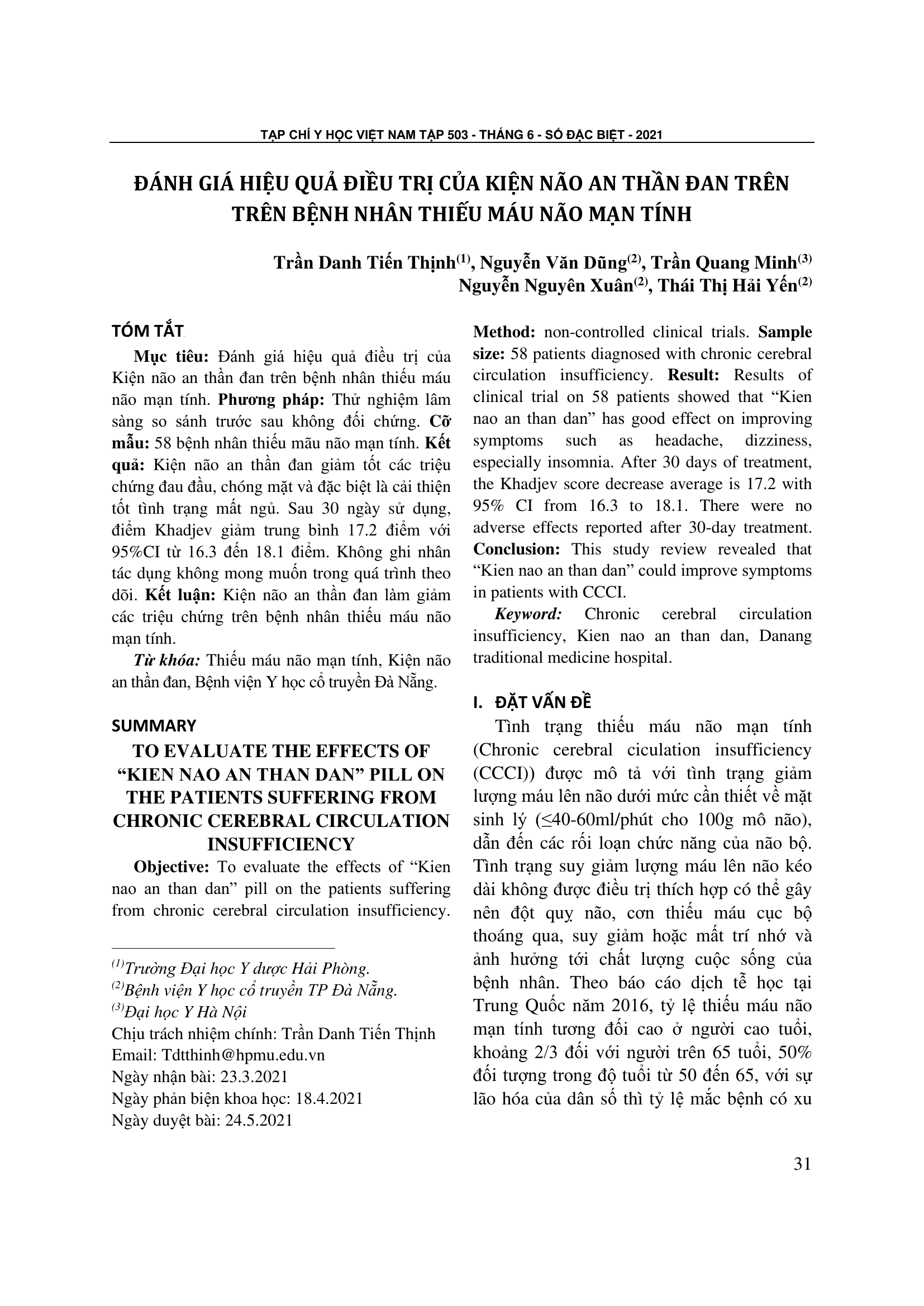 Đánh giá hiệu quả điều trị của Kiện não an thần đan trên bệnh nhân thiếu máu não mạn tính. Phương pháp: Thử nghiệm lâm sàng so sánh trước sau không đối chứng. Cỡ mẫu: 58 bệnh nhân thiếu mãu não mạn tính. Kết quả: Kiện não an thần đan giảm tốt các triệu chứng đau đầu, chóng mặt và đặc biệt là cải thiện tốt tình trạng mất ngủ. Sau 30 ngày sử dụng, điểm Khadjev giảm trung bình 17.2 điểm với 95%CI từ 16.3 đến 18.1 điểm. Không ghi nhân tác dụng không mong muốn trong quá trình theo dõi. Kết luận: Kiện não an thần đan làm giảm các triệu chứng trên bệnh nhân thiếu máu não mạn tính.