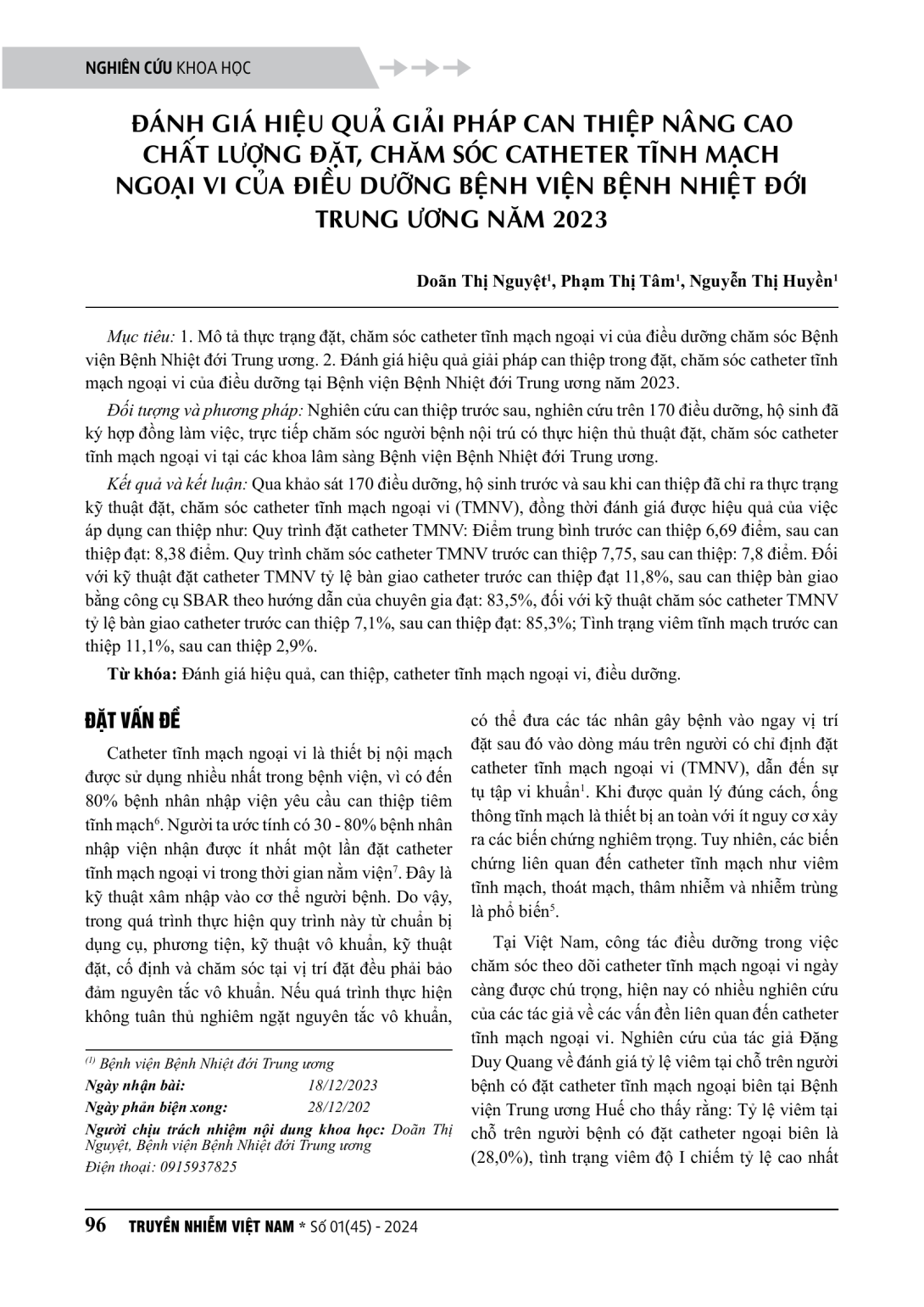 Mô tả thực trạng đặt, chăm sóc catheter tĩnh mạch ngoại vi của điều dưỡng chăm sóc Bệnh viện Bệnh Nhiệt đới Trung ương. Đánh giá hiệu quả giải pháp can thiệp trong đặt, chăm sóc catheter tĩnh mạch ngoại vi của điều dưỡng tại Bệnh viện Bệnh Nhiệt đới Trung ương năm 2023. Đối tượng và phương pháp: Nghiên cứu can thiệp trước sau, nghiên cứu trên 170 điều dưỡng, hộ sinh đã ký hợp đồng làm việc, trực tiếp chăm sóc người bệnh nội trú có thực hiện thủ thuật đặt, chăm sóc catheter tĩnh mạch ngoại vi tại các khoa lâm sàng Bệnh viện Bệnh Nhiệt đới Trung ương. Kết quả và kết luận: Qua khảo sát 170 điều dưỡng, hộ sinh trước và sau khi can thiệp đã chỉ ra thực trạng kỹ thuật đặt, chăm sóc catheter tĩnh mạch ngoại vi (TMNV), đồng thời đánh giá được hiệu quả của việc áp dụng can thiệp như: Quy trình đặt catheter TMNV: Điểm trung bình trước can thiệp 6,69 điểm, sau can, thiệp đạt: 8,38 điểm. Quy trình chăm sóc catheter TMNV trước can thiệp 7,75, sau can thiệp: 7,8 điểm. Đối với kỹ thuật đặt catheter TMNV tỷ lệ bàn giao catheter trước can thiệp đạt 11,8%, sau can thiệp bàn giao bằng công cụ SBAR theo hướng dẫn của chuyên gia đạt: 83,5%, đối với kỹ thuật chăm sóc catheter TMNV tỷ lệ bàn giao catheter trước can thiệp 7,1%, sau can thiệp đạt: 85,3%; Tình trạng viêm tĩnh mạch trước can thiệp 11,1%, sau can thiệp 2,9%.