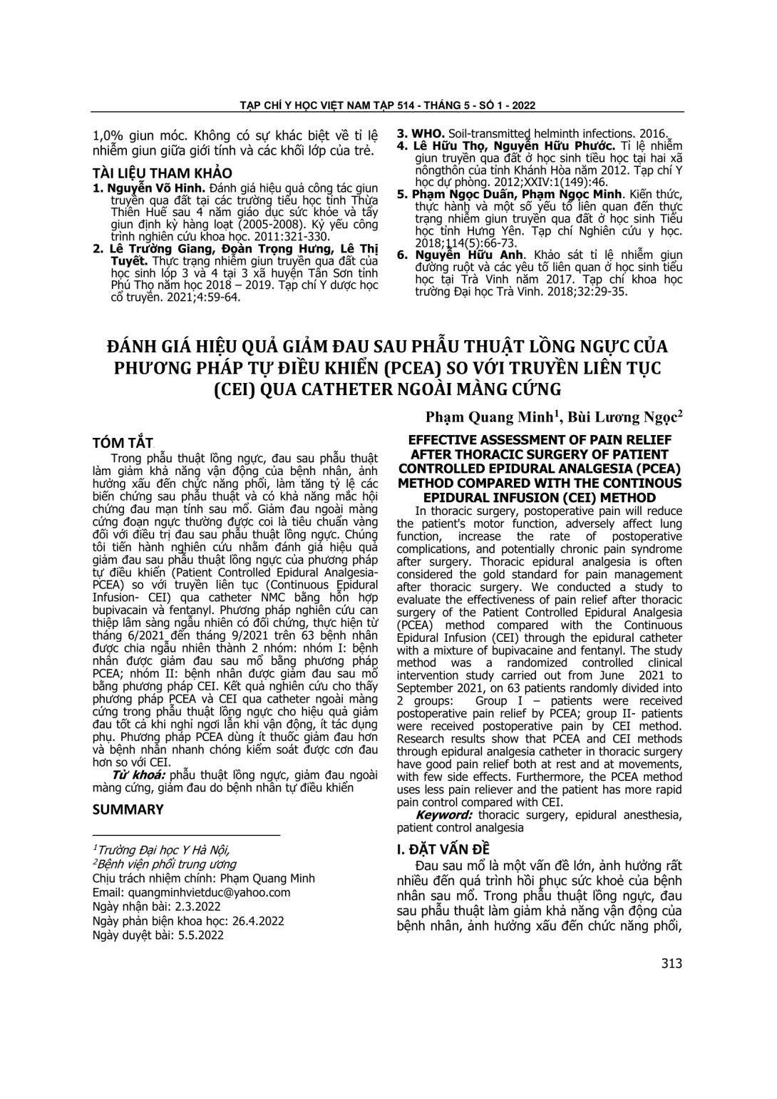 Trong phẫu thuật lồng ngực, đau sau phẫu thuật làm giảm khả năng vận động của bệnh nhân, ảnh hưởng xấu đến chức năng phổi, làm tăng tỷ lệ các biến chứng sau phẫu thuật và có khả năng mắc hội chứng đau mạn tính sau mổ. Giảm đau ngoài màng cứng đoạn ngực thường được coi là tiêu chuẩn vàng đối với điều trị đau sau phẫu thuật lồng ngực. Chúng tôi tiến hành nghiên cứu nhằm đánh giá hiệu quả giảm đau sau phẫu thuật lồng ngực của phương pháp tự điều khiển (Patient Controlled Epidural Analgesia- PCEA) so với truyền liên tục (Continuous Epidural Infusion- CEI) qua catheter NMC bằng hỗn hợp bupivacain và fentanyl. Phương pháp nghiên cứu can thiệp lâm sàng ngẫu nhiên có đối chứng, thực hiện từ tháng 6/2021 đến tháng 9/2021 trên 63 bệnh nhân được chia ngẫu nhiên thành 2 nhóm: nhóm I: bệnh nhân được giảm đau sau mổ bằng phương pháp PCEA; nhóm II: bệnh nhân được giảm đau sau mổ bằng phương pháp CEI. Kết quả nghiên cứu cho thấy phương pháp PCEA và CEI qua catheter ngoài màng cứng trong phẫu thuật lồng ngực cho hiệu quả giảm đau tốt cả khi nghỉ ngơi lẫn khi vận động, ít tác dụng phụ. Phương pháp PCEA dùng ít thuốc giảm đau hơn và bệnh nhân nhanh chóng kiểm soát được cơn đau hơn so với CEI.