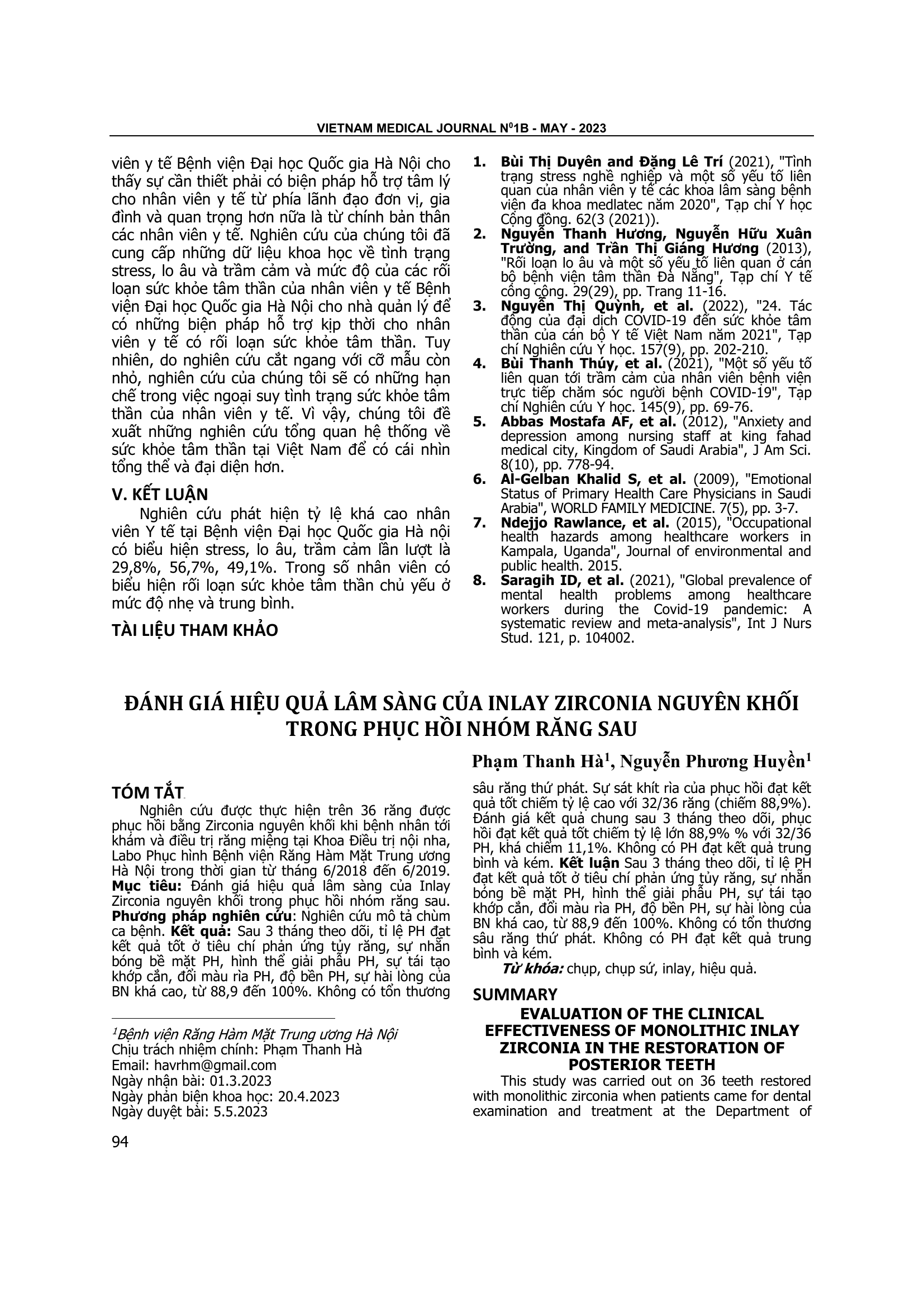 This study was carried out on 36 teeth restored with monolithic zirconia when patients came for dental examination and treatment at the Department of Endodontics, Prosthodontic Laboratory, National Hospital of Odonto-Stomatology during the period from June 2018 to June 2019. Objective: To evaluate the clinical effectiveness of monolithic Inlay Zirconia in restoring posterior teeth group. Methods: A case series. Results: After 3 months of follow-up, the restoration ratio achieved good results in the criteria of pulp response, surface smoothness, anatomical shape, occlusal reconstruction, margin discoloration, durability, and patient satisfaction of the restoration are quite high, from 88.9% to 100%. There was no secondary carious lesion. The closeness of the margin of the restoration achieved good results with a high-rate of 32/36 teeth (accounting for 88.9%). Assessing the general results after 3 months of follow-up, the recovery achieved good results, accounting for a large proportion of 88.9% with 32/36 restorations, or quite good, accounting for 11.1%. No restoration had average and poor results. Conclusion: After 3 months of follow-up, the proportion of restoration achieved good results in the criteria of pulp response, surface smoothness, anatomical shape, occlusal reconstruction, margin discoloration, stability, and patient satisfaction of the restoration are quite high, from 88.9% to 100%. There was no secondary carious lesion. No restoration result was average and poor.