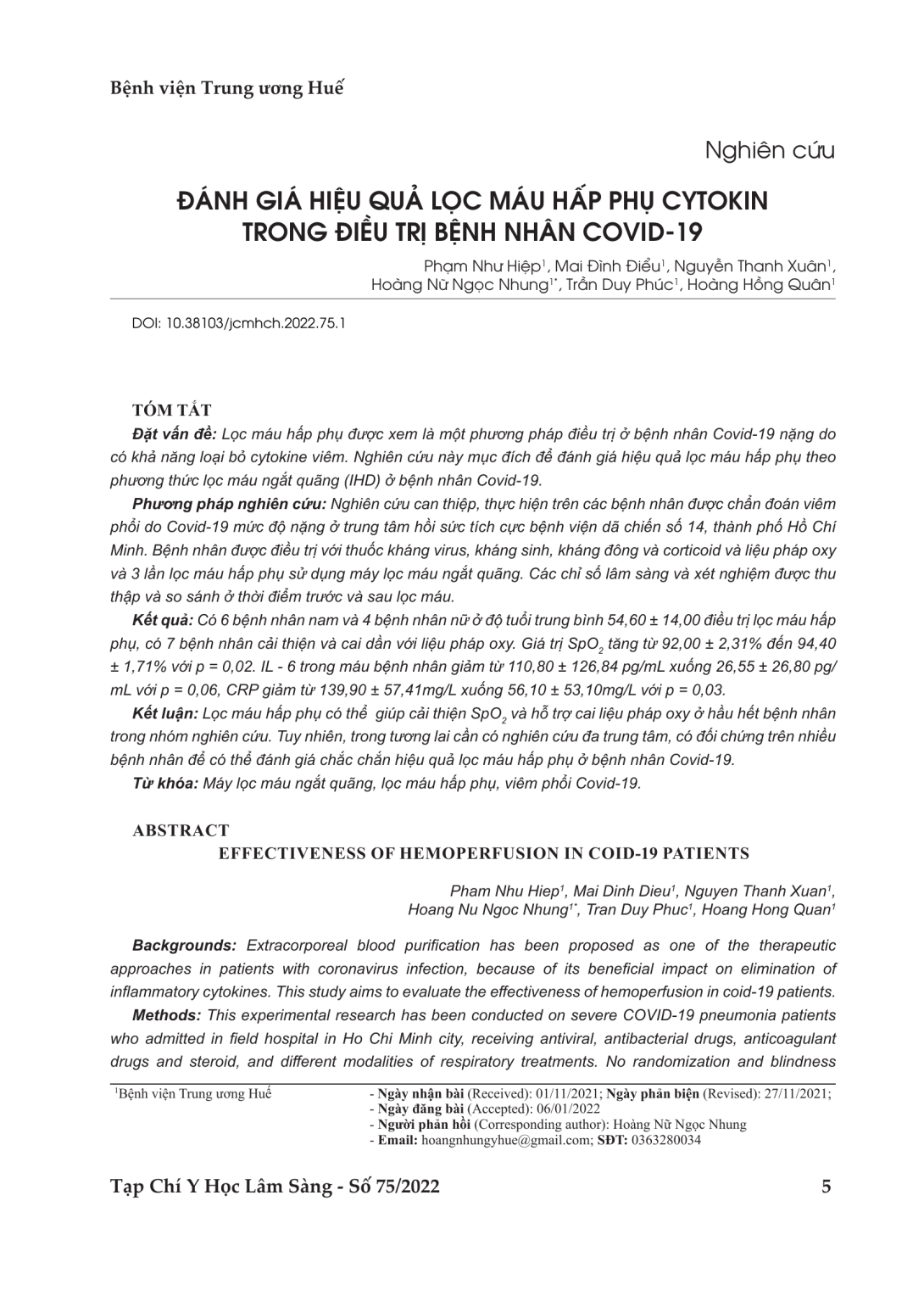 Lọc máu hấp phụ được xem là một phương pháp điều trị ở bệnh nhân Covid-19 nặng do có khả năng loại bỏ cytokine viêm. Nghiên cứu này mục đích để đánh giá hiệu quả lọc máu hấp phụ theo phương thức lọc máu ngắt quãng (IHD) ở bệnh nhân Covid-19. Phương pháp nghiên cứu: Nghiên cứu can thiệp, thực hiện trên các bệnh nhân được chẩn đoán viêm phổi do Covid-19 mức độ nặng ở trung tâm hồi sức tích cực bệnh viện dã chiến số 14, thành phố Hồ Chí Minh. Bệnh nhân được điều trị với thuốc kháng virus, kháng sinh, kháng đông và corticoid và liệu pháp oxy và 3 lần lọc máu hấp phụ sử dụng máy lọc máu ngắt quãng. Các chỉ số lâm sàng và xét nghiệm được thu thập và so sánh ở thời điểm trước và sau lọc máu. Kết quả: Có 6 bệnh nhân nam và 4 bệnh nhân nữ ở độ tuổi trung bình 54,60 ± 14,00 điều trị lọc máu hấp phụ, có 7 bệnh nhân cải thiện và cai dần với liệu pháp oxy. Giá trị SpO2 tăng từ 92,00 ± 2,31% đến 94,40 ± 1,71% với p = 0,02. IL - 6 trong máu bệnh nhân giảm từ 110,80 ± 126,84 pg/mL xuống 26,55 ± 26,80 pg/ mL với p = 0,06, CRP giảm từ 139,90 ± 57,41mg/L xuống 56,10 ± 53,10mg/L với p = 0,03. Kết luận: Lọc máu hấp phụ có thể giúp cải thiện SpO2 và hỗ trợ cai liệu pháp oxy ở hầu hết bệnh nhân trong nhóm nghiên cứu. Tuy nhiên, trong tương lai cần có nghiên cứu đa trung tâm, có đối chứ