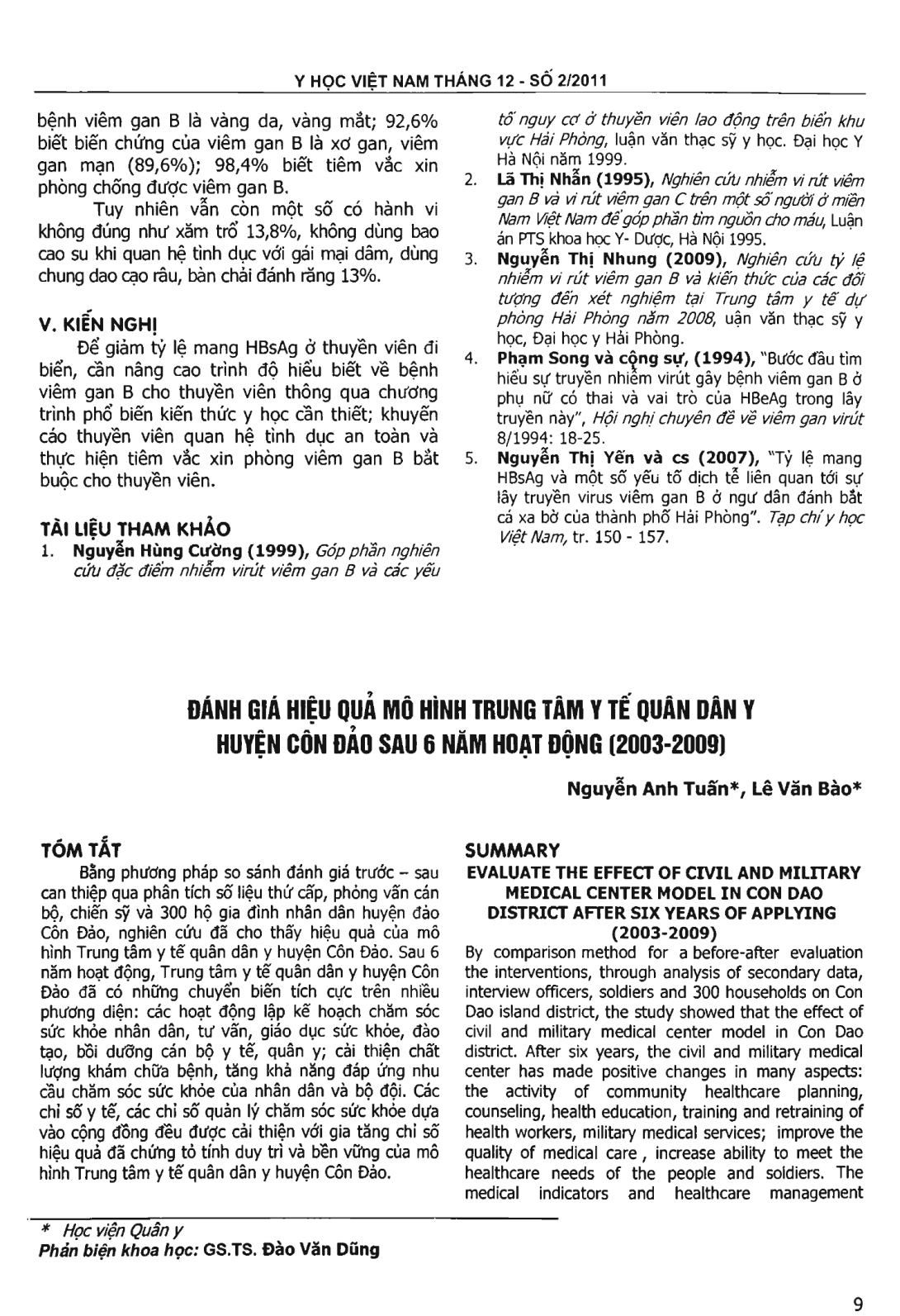 By comparison method for a before-after evaluation the interventions, through analysis of secondary data, interview officers, soldiers and 300 households on Con Dao island district, the study showed that the effect of civil and military medical center model in Con Dao district. After six years, the civil and military medical center has made positive changes in many aspects: the activity of community healthcare planning, counseling, health education, training and retraining of health workers, military medical services; improve the quality of medical care, increase ability to meet the healthcare needs of the people and soldiers. The medical indicators and healthcare management indicators based on community have improved with the growth of index effect, have proven the maintenance and solid of civil and military medical center model in Con Dao district.