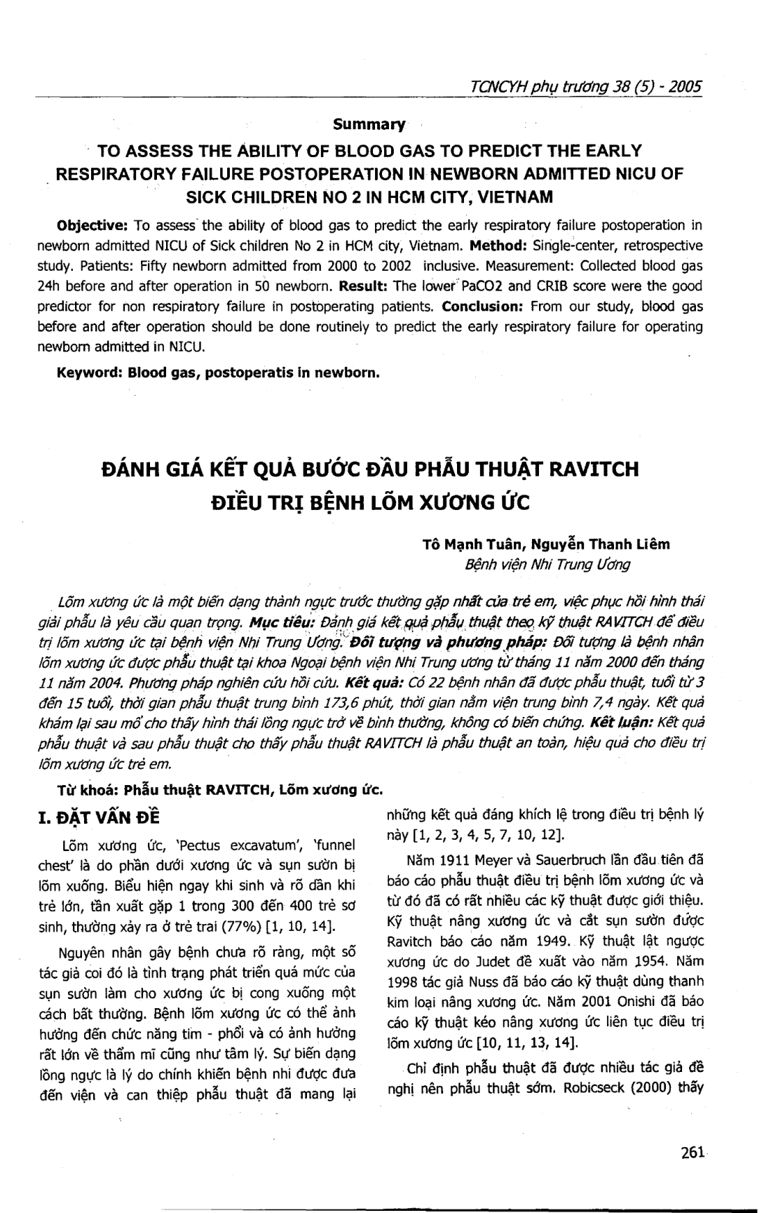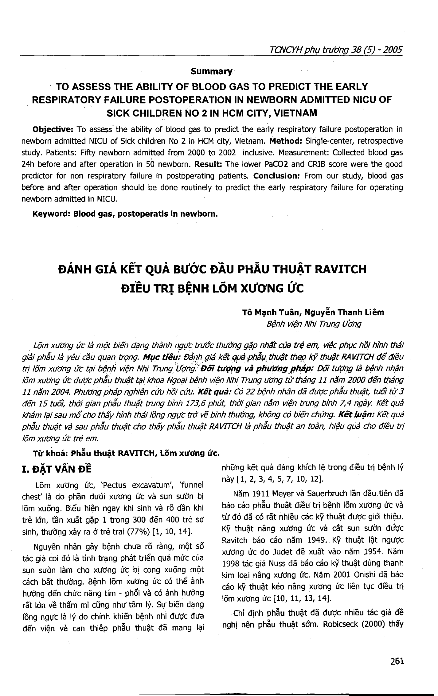 Lõm xương ức một dạng thành ngực trước thường gặp nhất ở trẻ em, do đó việc giải phẫu để khôi phục hình dạng là rất quan trọng. áp dụng kỹ thuật Ravitch để phẫu thuật và điều trị cho 22 bệnh nhân tại Bệnh viện Nhi trung ương từ 11/2000 đến 11/2004. 22 bênh nhân đã được phẫu thuật tuổi từ 3 đến 15, thời gian phẫu thuật trung bình 174 phút, thời gian nằm viện trung bình 7,4 ngày. Sau mổ và điều trị, hình thái lồng ngực trở lại bình thường, không có biến chứng. Như vậy, phãu thuật Ravitch an toàn, hiệu quả trong điều trị bệnh lõm xương ngực cho trẻ em.
