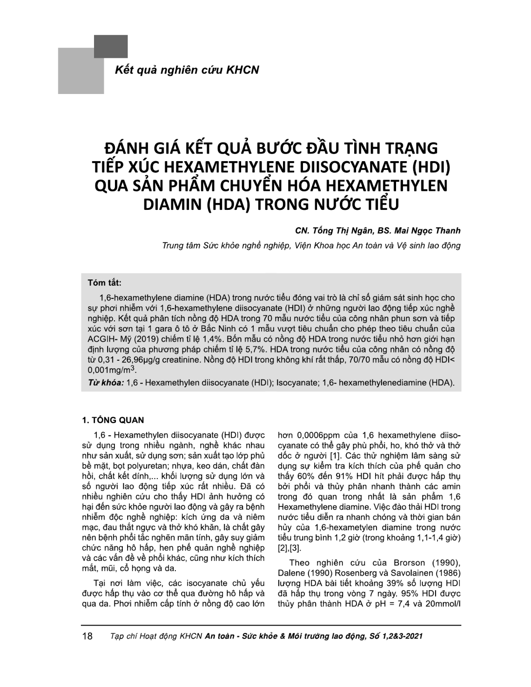 1,6-hexamethylene diamine (HDA) trong nước tiểu đóng vai trò là chỉ số giám sát sinh học cho sự phơi nhiễm với 1,6-hexamethylene diisocyanate (HDI) ở những người lao động tiếp xúc nghề nghiệp. Kết quả phân tích nồng độ HDA trong 70 mẫu nước tiểu của công nhân phun sơn và tiếp xúc với sơn tại 1 gara ô tô ở Bắc Ninh có 1 mẫu vượt tiêu chuẩn cho phép theo tiêu chuẩn của ACGIH- Mỹ (2019) chiếm tỉ lệ 1,4%. Bốn mẫu có nồng độ HDA trong nước tiểu nhỏ hơn giới hạn định lượng của phương pháp chiếm tỉ lệ 5,7%. HDA trong nước tiểu của công nhân có nồng độ từ 0,31 - 26,96pg/g creatinine. Nồng độ HDI trong không khí rất thấp, 70/70 mẫu có nồng độ HDI< 0,001 mg/m3.
