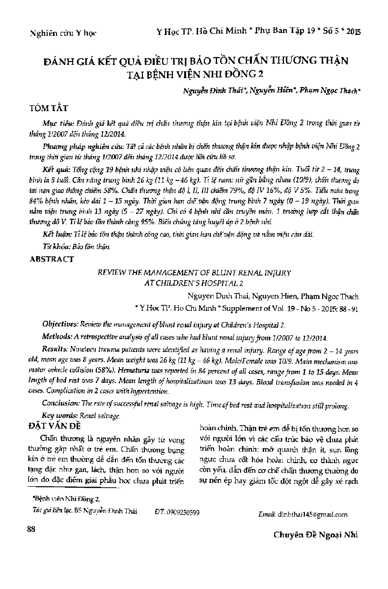 Đánh giá kết quả điều trị bảo tồn chấn thương thận tại Bệnh viện Nhi Đồng