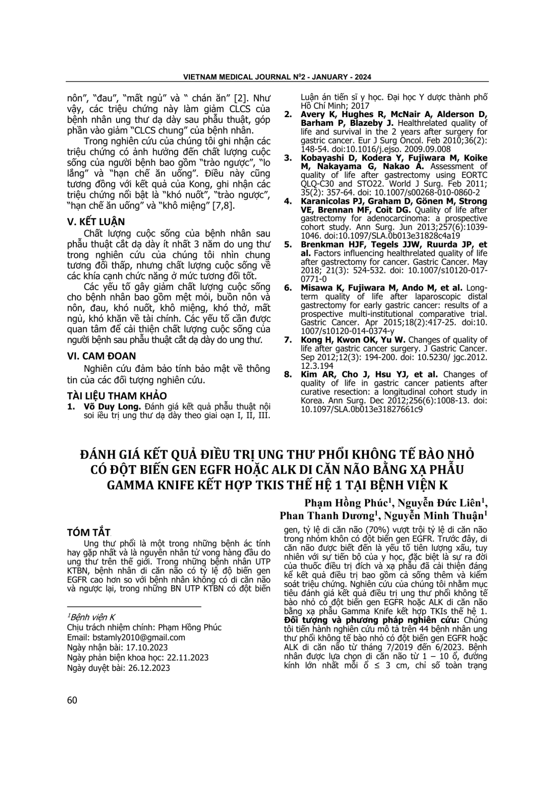 Đánh giá kết quả điều trị ung thư phổi không tế bào nhỏ có đột biến gen EGFR hoặc ALK di căn não bằng xạ phẫu Gamma Knife kết hợp TKIs thế hệ 1. Đối tượng và phương pháp nghiên cứu: Chúng tôi tiến hành nghiên cứu mô tả trên 44 bệnh nhân ung thư phổi không tế bào nhỏ có đột biến gen EGFR hoặc ALK di căn não từ tháng 7/2019 đến 6/2023. Bệnh nhân được lựa chọn di căn não từ 1 – 10 ổ, đường kính lớn nhất mỗi ổ ≤ 3 cm, chỉ số toàn trạng Karnofsky ≥ 60, có đột biến EGFR hoặc ALK, điều trị TKIs thế hệ 1 pha đầu. Bệnh nhân được xạ phẫu bằng máy Gamma Knife thế hệ Icon với liều chỉ định 20 – 24 Gy với khối u < 2cm, 18 – 20 Gy với khối u 2 – 3 cm. Bệnh nhân điều trị TKIs thế hệ 1 (erlotinib hoặc gefitinib hoặc crizotinib) 1 viên/ngày. Bệnh nhân được đánh giá đáp ứng triệu chứng lâm sàng và hình ảnh theo tiêu chuẩn RANO mỗi 6 tháng, và kết quả sống thêm. Kết quả: Trong nghiên cứu của chúng tôi, tỷ lệ sống thêm không tiến triển tại não tại 12 tháng là 94,8%, 24 tháng là 51,7%. Tỷ lệ sống thêm toàn bộ tại 12 tháng là 83,9%, 24 tháng là 58,6%, 3 năm là 39,1%, trung vị thời gian sống thêm toàn bộ là 28 tháng ± 3,3 tháng. Kết luận: Xạ phẫu Gamma Knife kết hợp TKIs thế hệ 1 là một phương pháp điều trị hiệu quả đối với tổn thương di căn não của ung thư phổi không tế bào nhỏ có đột biến gen EGFR hoặc ALK.