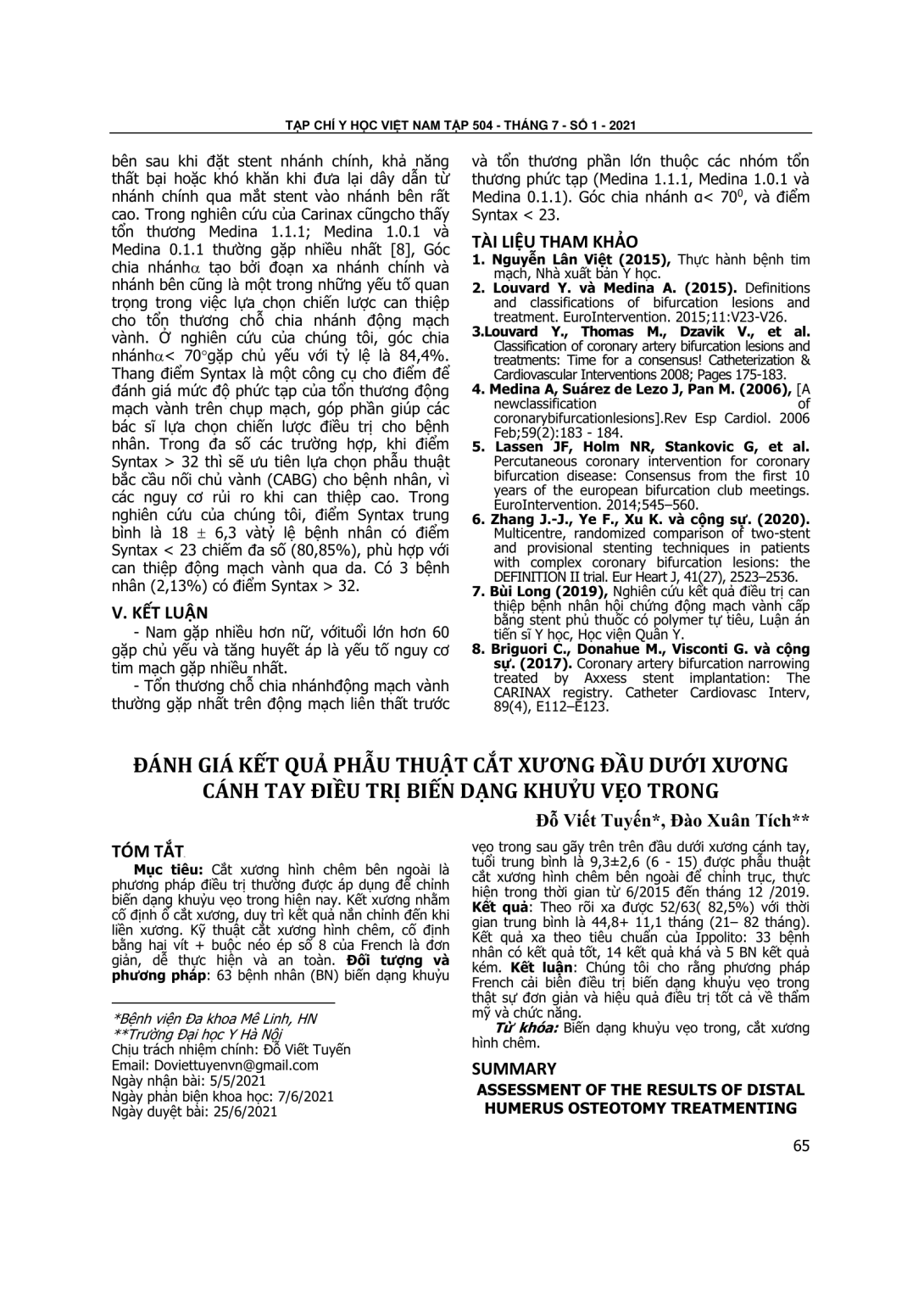 Cắt xương hình chêm bên ngoài là phương pháp điều trị thường được áp dụng để chỉnh biến dạng khuỷu vẹo trong hiện nay. Kết xương nhằm cố định ổ cắt xương, duy trì kết quả nắn chỉnh đến khi liền xương. Kỹ thuật cắt xương hình chêm, cố định bằng hai vít + buộc néo ép số 8 của French là đơn giản, dễ thực hiện và an toàn. Đối tượng và phương pháp: 63 bệnh nhân (BN) biến dạng khuỷu vẹo trong sau gãy trên trên đầu dưới xương cánh tay, tuổi trung bình là 9,3±2,6 (6 - 15) được phẫu thuật cắt xương hình chêm bên ngoài để chỉnh trục, thực hiện trong thời gian từ 6/2015 đến tháng 12 /2019. Kết quả: Theo dõi xa được 52/63( 82,5%) với thời gian trung bình là 44,8+ 11,1 tháng (21– 82 tháng). Kết quả xa theo tiêu chuẩn của Ippolito: 33 bệnh nhân có kết quả tốt, 14 kết quả khá và 5 BN kết quả kém. Kết luận: Chúng tôi cho rằng phương pháp French cải biên điều trị biến dạng khuỷu vẹo trong thật sự đơn giản và hiệu quả điều trị tốt cả về thẩm mỹ và chức năng.