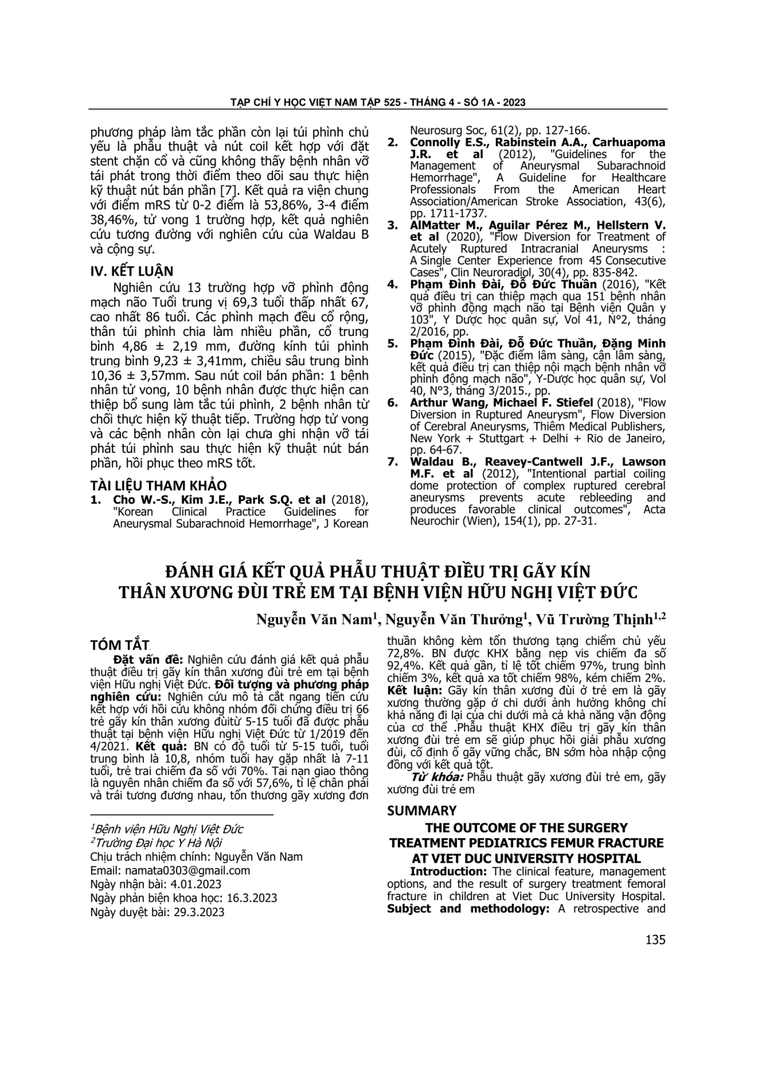 Nghiên cứu đánh giá kết quả phẫu thuật điều trị gãy kín thân xương đùi trẻ em tại bệnh viện Hữu nghị Việt Đức. Đối tượng và phương pháp nghiên cứu: Nghiên cứu mô tả cắt ngang tiến cứu kết hợp với hồi cứu không nhóm đối chứng điều trị 66 trẻ gãy kín thân xương đùitừ 5-15 tuổi đã được phẫu thuật tại bệnh viện Hữu nghị Việt Đức từ 1/2019 đến 4/2021. Kết quả: BN có độ tuổi từ 5-15 tuổi, tuổi trung bình là 10,8, nhóm tuổi hay gặp nhất là 7-11 tuổi, trẻ trai chiếm đa số với 70%. Tai nạn giao thông là nguyên nhân chiếm đa số với 57,6%, tỉ lệ chân phải và trái tương đương nhau, tổn thương gãy xương đơn thuần không kèm tổn thương tạng chiểm chủ yếu 72,8%. BN được KHX bằng nẹp vis chiếm đa số 92,4%. Kết quả gần, tỉ lệ tốt chiếm 97%, trung bình chiếm 3%, kết quả xa tốt chiếm 98%, kém chiếm 2%. Kết luận: Gãy kín thân xương đùi ở trẻ em là gãy xương thường gặp ở chi dưới ảnh hưởng không chỉ khả năng đi lại của chi dưới mà cả khả năng vận động của cơ thể .Phẫu thuật KHX điều trị gãy kín thân xương đùi trẻ em sẽ giúp phục hồi giải phẫu xương đùi, cố định ổ gãy vững chắc, BN sớm hòa nhập cộng đồng với kết quả tốt.
