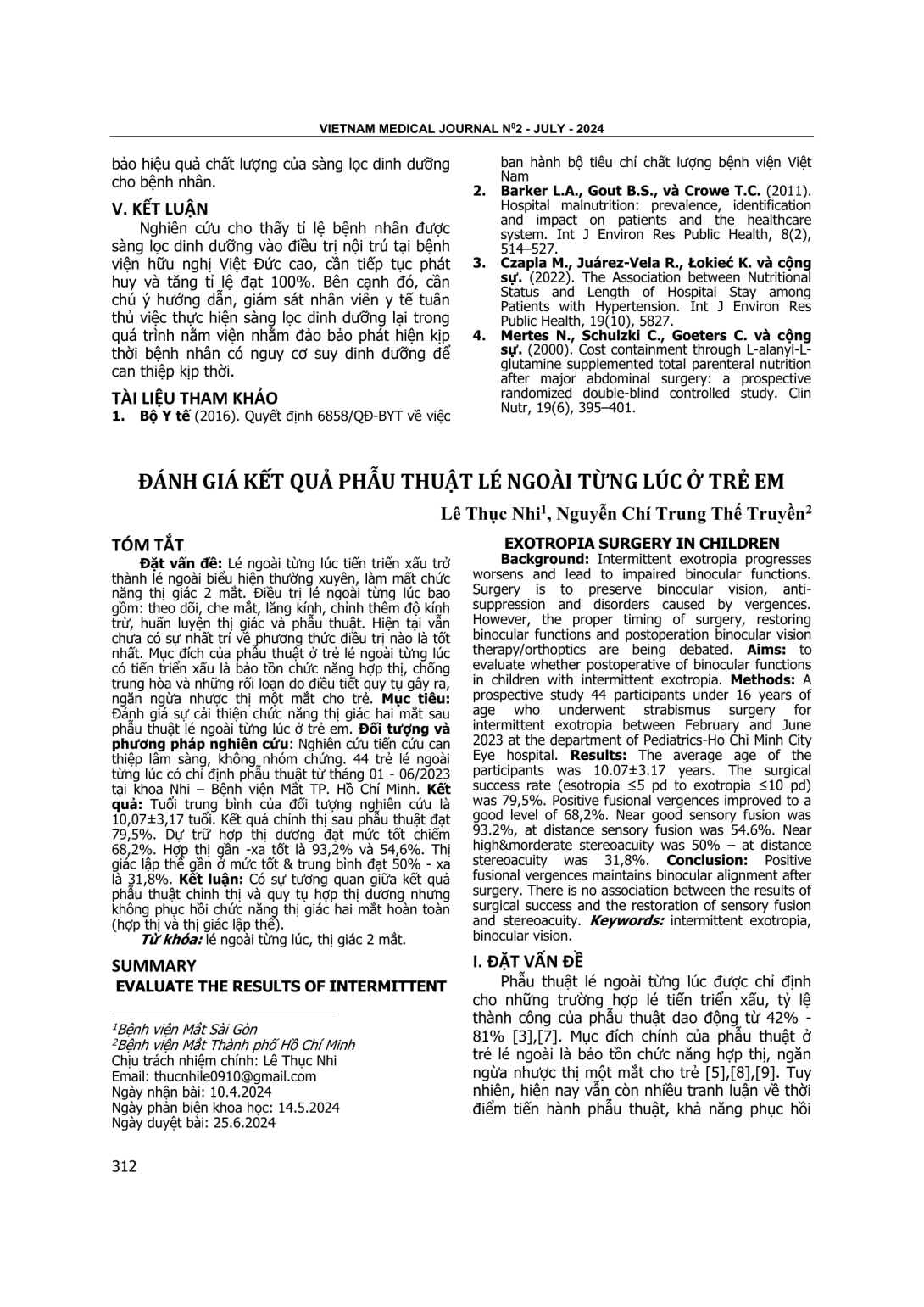 Lé ngoài từng lúc tiến triển xấu trở thành lé ngoài biểu hiện thường xuyên, làm mất chức năng thị giác 2 mắt. Điều trị lé ngoài từng lúc bao gồm: theo dõi, che mắt, lăng kính, chỉnh thêm độ kính trừ, huấn luyện thị giác và phẫu thuật. Hiện tại vẫn chưa có sự nhất trí về phương thức điều trị nào là tốt nhất. Mục đích của phẫu thuật ở trẻ lé ngoài từng lúc có tiến triển xấu là bảo tồn chức năng hợp thị, chống trung hòa và những rối loạn do điều tiết quy tụ gây ra, ngăn ngừa nhược thị một mắt cho trẻ. Mục tiêu: Đánh giá sự cải thiện chức năng thị giác hai mắt sau phẫu thuật lé ngoài từng lúc ở trẻ em. Đối tượng và phương pháp nghiên cứu: Nghiên cứu tiến cứu can thiệp lâm sàng, không nhóm chứng. 44 trẻ lé ngoài từng lúc có chỉ định phẫu thuật từ tháng 01 - 06/2023 tại khoa Nhi – Bệnh viện Mắt TP. Hồ Chí Minh. Kết quả: Tuổi trung bình của đối tượng nghiên cứu là 10,07±3,17 tuổi. Kết quả chỉnh thị sau phẫu thuật đạt 79,5%. Dự trữ hợp thị dương đạt mức tốt chiếm 68,2%. Hợp thị gần -xa tốt là 93,2% và 54,6%. Thị giác lập thể gần ở mức tốt & trung bình đạt 50% - xa là 31,8%. Kết luận: Có sự tương quan giữa kết quả phẫu thuật chỉnh thị và quy tụ hợp thị dương nhưng không phục hồi chức năng thị giác hai mắt hoàn toàn (hợp thị và thị giác lập thể).