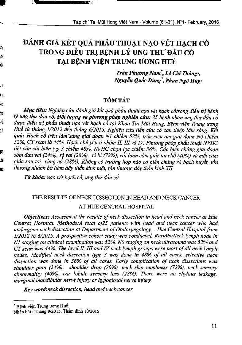 Objectives: Assessment the results of neck dissection in head and neck cancer at Hue Central Hospital. Methods: A total 0125 patients with head and neck cancer who had undergone neck dissection at Department of Otoloryngology - Hue Central Hospital from 1/2012 to 6/2015. A prospective cohort study was conducted. Results: Neck lymph node in N1 staging on clinical examination was 52 percent, NO staging on neck ultrasound was 52 percent and CT scan was 44 percent. The level II, III and IV neck lymph groups were most of all neck lymph nodes. Modified neck dissection type 3 was done in 48 percent of all cases, selective neck dissection was done in 36 percent of all cases. Early complication of neck dissections was shoulder pain (24 percent), shoulder drop (20 percent), neck skin numbness (72 percent), neck sensory abnormality (40 percent), ear lobule sensory loss (28 percent). There were no chylous leakage, marginal mandibular nerve injury or hypoglosal nerve injury.