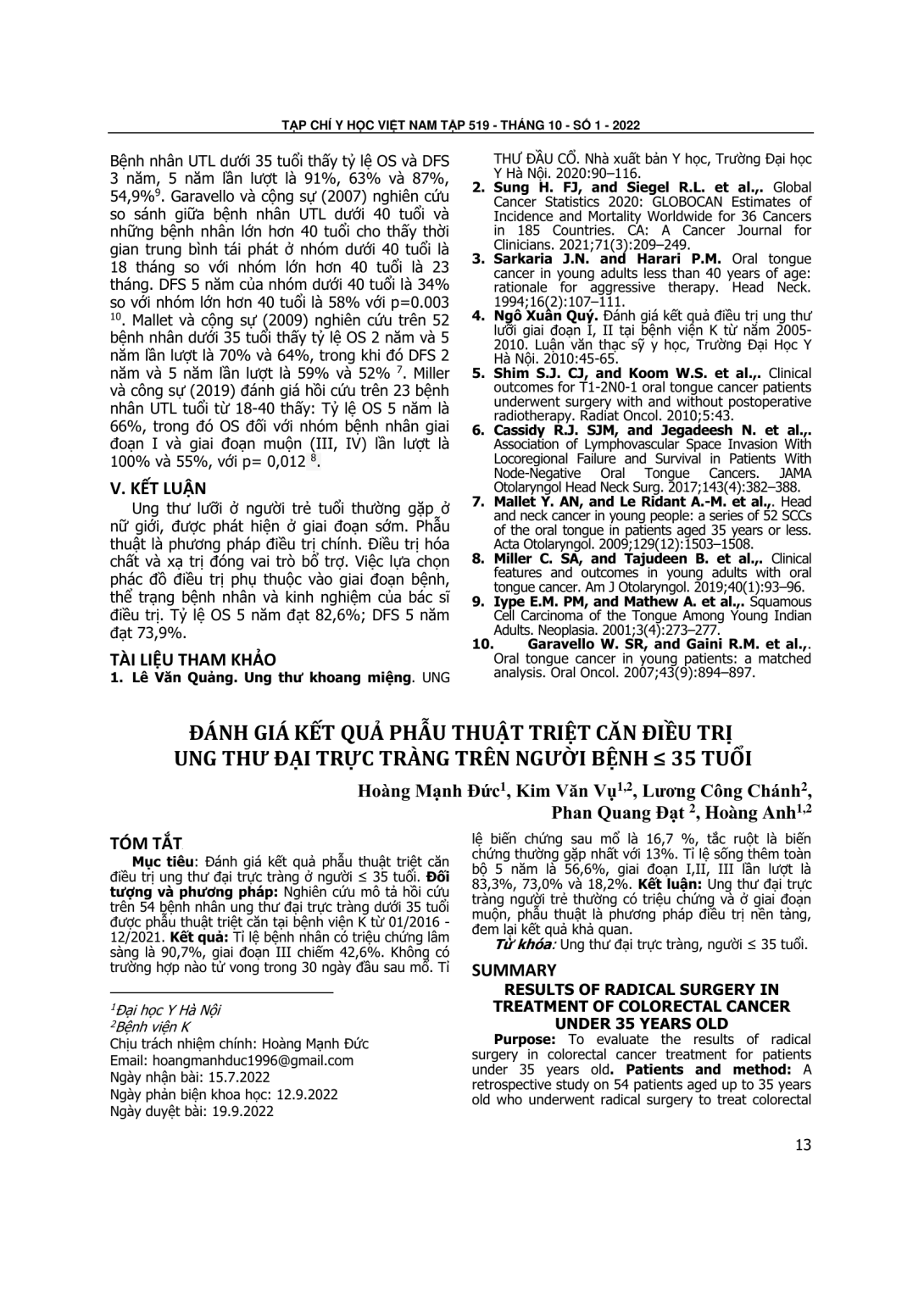 To evaluate the results of radical surgery in colorectal cancer treatment for patients under 35 years old. Patients and method: A retrospective study on 54 patients aged up to 35 years old who underwent radical surgery to treat colorectal cancer in the National cancer hospital from 01/2016 to 12/2021. Results: Rate of symtomatic patient was 90,7% while the rate of stage III was 42,6%. There was no operative mortality in over 30 days after surgery. Postoperative complications occurred in 9 out of 54 patients, bowel obstruction was the most common complication (13%). The five-year overall survival rate was 56,6%, in specific, stage I, II, III were 83,3%, 73,0% and 18,2%, respectively.