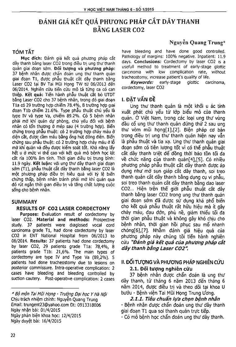 Purpose: Evaluation result of cordectomy by laser CO2. Material and methods: Prospective study. 37 patients were diaglosed vocal cord carcinoma grade Tl, had done cordectomy by laser CO2 in ENT National Hospital from 06/2013 to 06/2014. Results: 37 patients had done cordectomy by laser CO2, 29 patients grade T1a: 78,4 percent, 8 patients grade T1b: 21,6 percent. The main types of cordectomy are type IV and Type Va (89,2 percent). 5 patients had done tracheostomy due to lesions on posterior commissure. Intra-operative complication: 2 cases have bleeding and bleeding controlled by suction cautery. Post-operative complication: 2 cases have bleeding and have done good controlled. Pathology of margins: 100 percent negative. Inpatient: 11.9 days. Conclusions: Cordectomy by laser CO2 is a usefull method to treatment of early-stage glottic carcinoma with low complication rate, without tracheostomy, increase patient's quality of life.