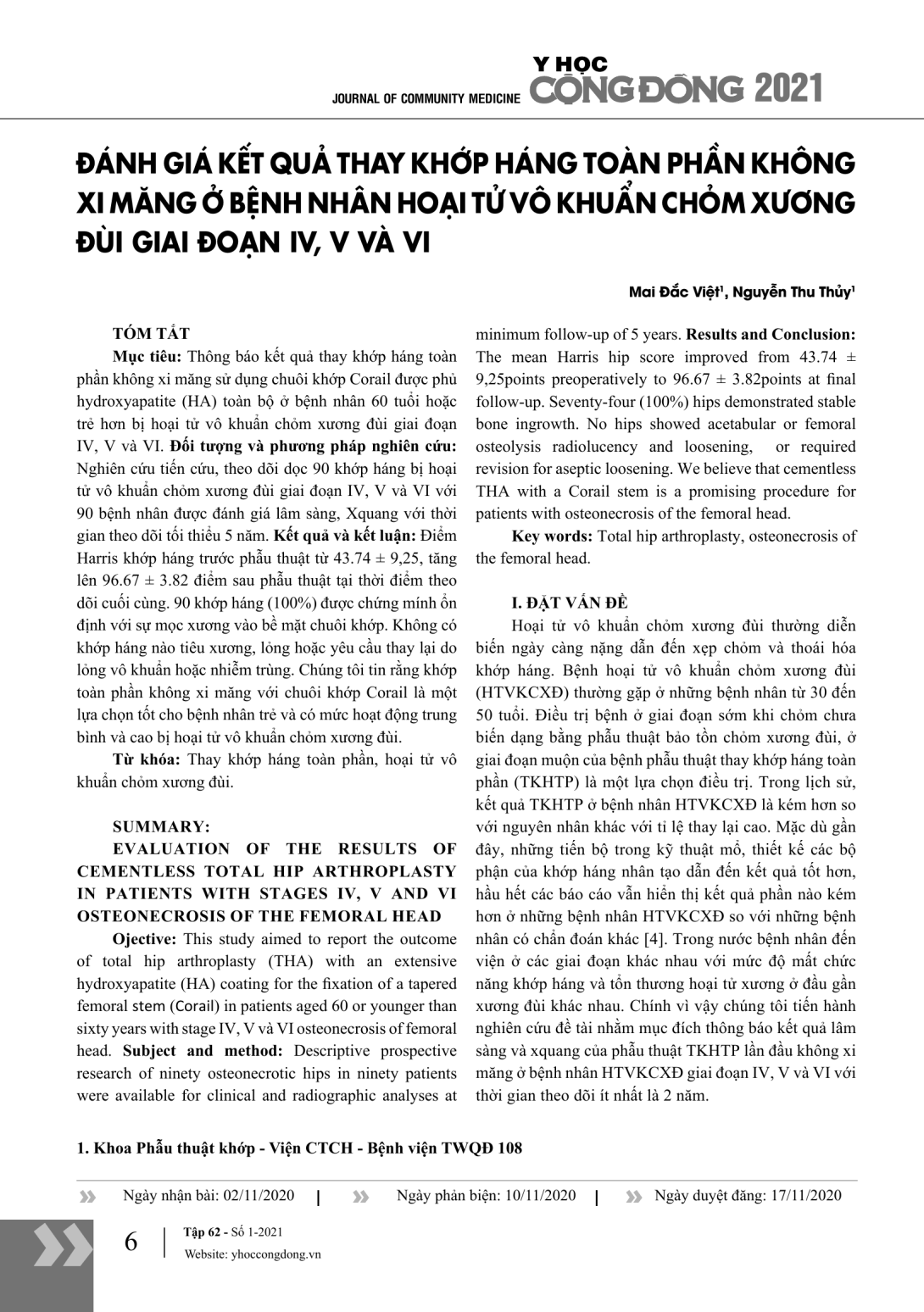 Thông báo kết quả thay khớp háng toàn phần không xi măng sử dụng chuôi khớp Corail được phủ hydroxyapatite (HA) toàn bộ ở bệnh nhân 60 tuổi hoặc trẻ hơn bị hoại tử vô khuẩn chỏm xương đùi giai đoạn IV, V và VI. Nghiên cứu tiến cứu, theo dõi dọc 90 khớp háng bị hoại tử vô khuẩn chỏm xương đùi giai đoạn IV, V và VI với 90 bệnh nhân được đánh giá lâm sàng, Xquang với thời gian theo dõi tối thiểu 5 năm. Điểm Harris khớp háng trước phẫu thuật từ 43.74 ± 9,25, tăng lên 96.67 ± 3.82 điểm sau phẫu thuật tại thời điểm theo dõi cuối cùng. 90 khớp háng (100%) được chứng mính ổn định với sự mọc xương vào bề mặt chuôi khớp. Không có khớp háng nào tiêu xương, lỏng hoặc yêu cầu thay lại do lỏng vô khuẩn hoặc nhiễm trùng. Chúng tôi tin rằng khớp toàn phần không xi măng với chuôi khớp Corail là một lựa chọn tốt cho bệnh nhân trẻ và có mức hoạt động trung bình và cao bị hoại tử vô khuẩn chỏm xương đùi.