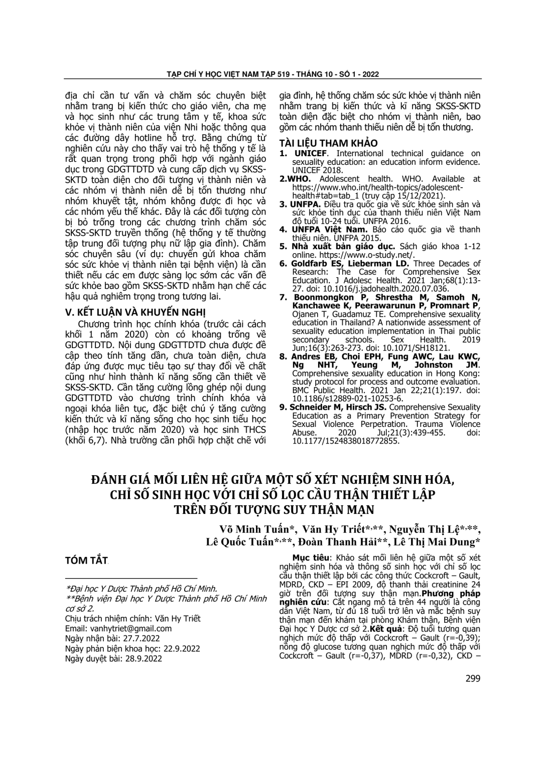 Khảo sát mối liên hệ giữa một số xét nghiệm sinh hóa và thông số sinh học với chỉ số lọc cầu thận thiết lập bởi các công thức Cockcroft – Gault, MDRD, CKD – EPI 2009, độ thanh thải creatinine 24 giờ trên đối tượng suy thận mạn.Phương pháp nghiên cứu: Cắt ngang mô tả trên 44 người là công dân Việt Nam, từ đủ 18 tuổi trở lên và mắc bệnh suy thận mạn đến khám tại phòng Khám thận, Bệnh viện Đại học Y Dược cơ sở 2.Kết quả: Độ tuổi tương quan nghịch mức độ thấp với Cockcroft – Gault (r=-0,39); nồng độ glucose tương quan nghịch mức độ thấp với Cockcroft – Gault (r=-0,37), MDRD (r=-0,32), CKD –EPI 2009 (r=-0,34); nồng độ creatinine tương quan nghịch mức độ cao với Cockcroft – Gault (r=-0,82), MDRD (r=-0,92), CKD – EPI 2009 (r=-0,90), CrCl 24h (r=0,71); nồng độ urea tương quan nghịch mức độ cao với Cockcroft – Gault (r=-0,63), MDRD (r=-0,73), CKD – EPI 2009 (r=-0,73), CrCl 24h (r=-0,48); giới tính, chỉ số BMI, huyết áp, nồng độ albumin, nồng độ protein và nồng độ acid uric không có mối tương quan với eGFR được tính bởi các công thức. Bên cạnh đó, CrCl 24h tương quan thuận mức độ cao với Cockcroft – Gault (r=0,72), MDRD (0,77), CKD – EPI 2009 (0,78). eGFR được tính bởi MDRD có sai lệch thấp nhất với CrCl 24h (hiệu số -1,44). Kết luận: Có mối liên hệ giữa độ tuổi, nồng độ glucose máu, nồng độ urea và nồng độ creatinine, CrCl 24h với độ lọc cầu thận thiết lập; công thức eGFR MDRD ước đoán tốt nhất với CrCl 24h.