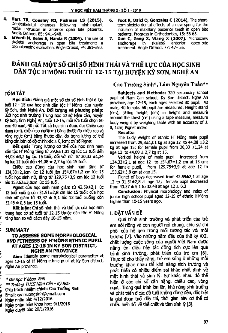 Đánh giá một số chỉ số hình thái và thể lực của học sinh dân tộc H'Mông tuổi từ 12-15 tại huyện Kỳ Sơn, Nghệ An