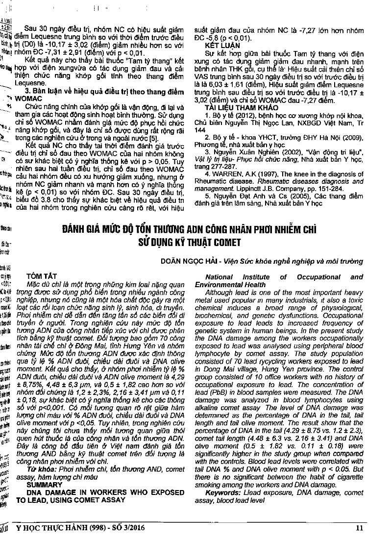 Although lead is one of the most important heavy metal used popular in many industrials, it also a toxic chemical induces a broad range of physiological, biochemical, and genetic dysfunctions. Occupational exposure to lead leads to increased frequency of genetic system in human beings. In the present study the DNA damage among the workers occupationally exposed to lead was analysed using peripheral blood lymphocyte by comet assay. The study population consisted of 70 lead recycling workers exposed to lead in Dong Mai viIlage, Hung Yen province. The control group consisted of 10 office workers with no history of occupational exposure to lead. The concentration of lead (PbB) in blood samples was measured. The DNA damage was analyzed in blood lymphocytes using alkaline comet assay. The level of DNA damage was determined as the percentage of DNA in the tail, tail length and tail olive moment. The result shows that the percentage of DNA in the tail (4.29 +/- 8.75 vs. 1.2 +/- 2.3), comet tail length (4.48 +/- 6.3 vs. 2.16 +/- 3.41) and DNA olive moment (0.5 +/- 1.82 vs. 0.11 +/- 0.18) were significantly higher in the study group when compared with the controls. Blood lead levels were correlated with tail DNA percent and DNA olive moment with p 0.05. But there is no significant between the habit of cigarette smoking among the workers and DNA damage.