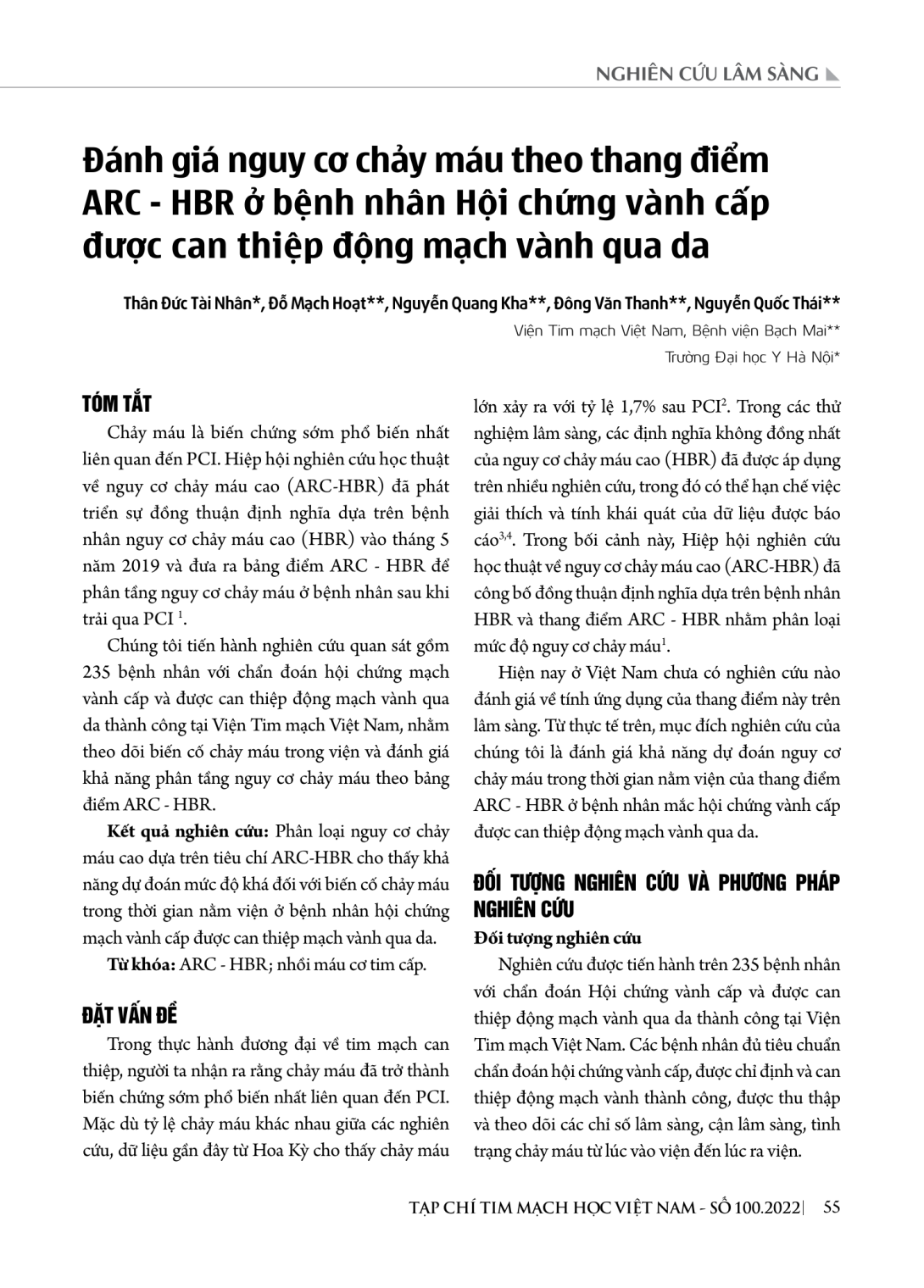 Chảy máu là biến chứng sớm phổ biến nhất liên quan đến PCI. Hiệp hội nghiên cứu học thuật về nguy cơ chảy máu cao (ARC-HBR) đã phát triển sự đồng thuận định nghĩa dựa trên bệnh nhân nguy cơ chảy máu cao (HBR) vào tháng 5 năm 2019 và đưa ra bảng điểm ARC - HBR để phân tầng nguy cơ chảy máu ở bệnh nhân sau khi trải qua PCI 1. Chúng tôi tiến hành nghiên cứu quan sát gồm 235 bệnh nhân với chẩn đoán hội chứng mạch vành cấp và được can thiệp động mạch vành qua da thành công tại Viện Tim mạch Việt Nam, nhằm theo dõi biến cố chảy máu trong viện và đánh giá khả năng phân tầng nguy cơ chảy máu theo bảng điểm ARC - HBR. Kết quả nghiên cứu: Phân loại nguy cơ chảy máu cao dựa trên tiêu chí ARC-HBR cho thấy khả năng dự đoán mức độ khá đối với biến cố chảy máu trong thời gian nằm viện ở bệnh nhân hội chứng mạch vành cấp được can thiệp mạch vành qua da.