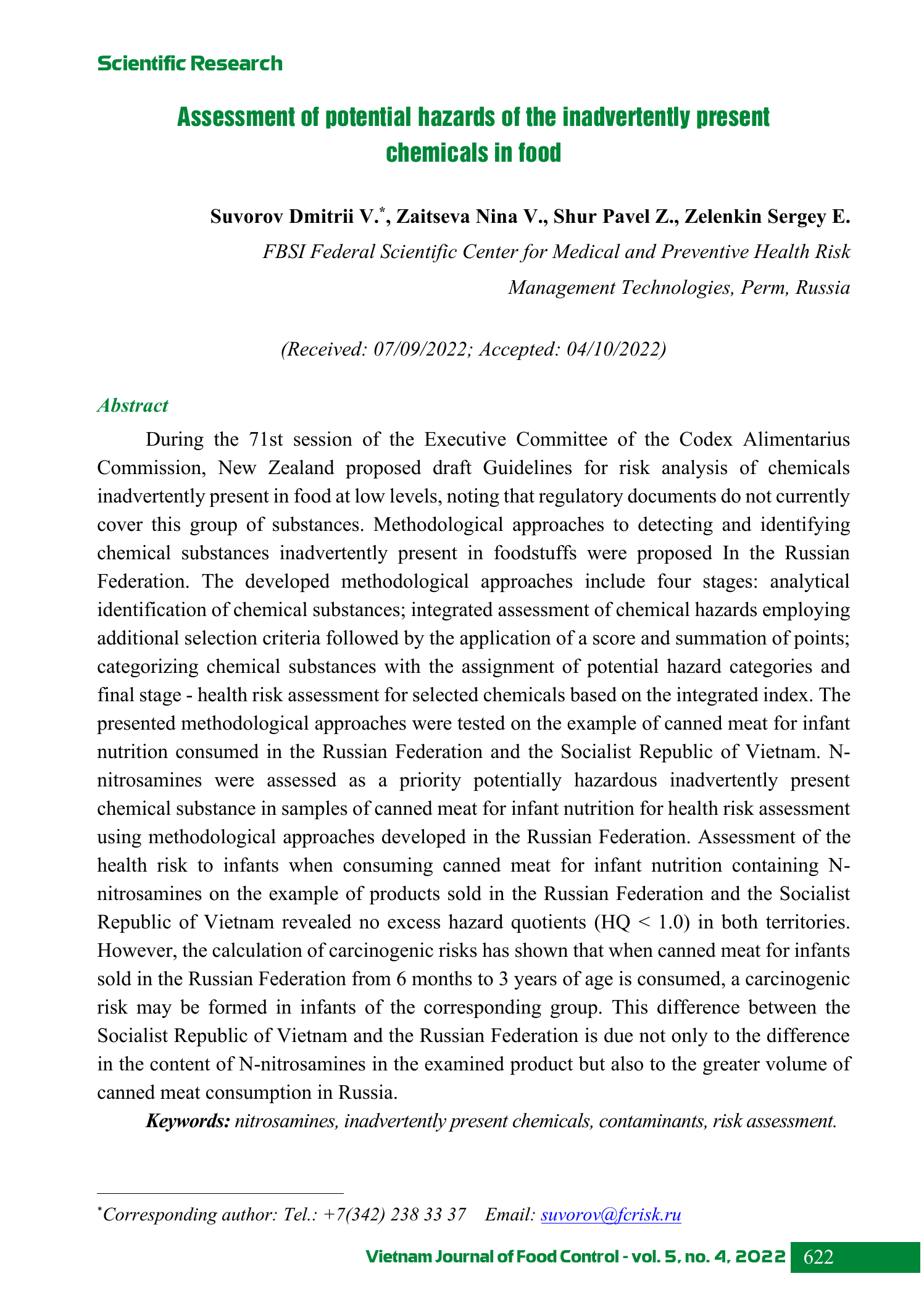 During the 71st session of the Executive Committee of the Codex Alimentarius Commission, New Zealand proposed draft Guidelines for risk analysis of chemicals inadvertently present in food at low levels, noting that regulatory documents do not currently cover this group of substances. Methodological approaches to detecting and identifying chemical substances inadvertently present in foodstuffs were proposed In the Russian Federation. The developed methodological approaches include four stages: analytical identification of chemical substances; integrated assessment of chemical hazards employing additional selection criteria followed by the application of a score and summation of points; categorizing chemical substances with the assignment of potential hazard categories and final stage - health risk assessment for selected chemicals based on the integrated index. The presented methodological approaches were tested on the example of canned meat for infant nutrition consumed in the Russian Federation and the Socialist Republic of Vietnam. N- nitrosamines were assessed as a priority potentially hazardous inadvertently present chemical substance in samples of canned meat for infant nutrition for health risk assessment using methodological approaches developed in the Russian Federation. Assessment of the health risk to infants when consuming canned meat for infant nutrition containing N- nitrosamines on the example of products sold in the Russian Federation and the Socialist Republic of Vietnam revealed no excess hazard quotients (HQ < 1.0) in both territories. However, the calculation of carcinogenic risks has shown that when canned meat for infants sold in the Russian Federation from 6 months to 3 years of age is consumed, a carcinogenic risk may be formed in infants of the corresponding group. This difference between the Socialist Republic of Vietnam and the Russian Federation is due not only to the difference in the content of N-nitrosamines in the examined product but also to the greater volume of canned meat consumption in Russia.