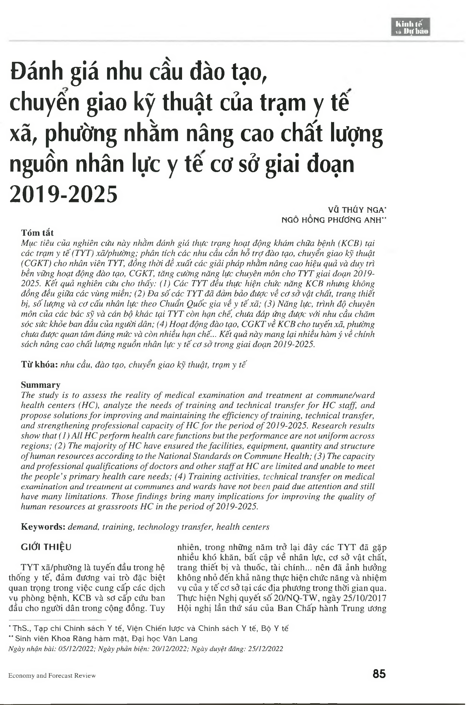 The study is to assess the reality of medical examination and treatment at commune/ward health centers (HC), analyze the needs of training and technical transfer for HC staff, and propose solutions for improving and maintaining the efficiency of training, technical transfer, and strengthening professional capacity of HC for the period of 2019-2025. Research results show that (1) All HC perform health care functions but the performance are not uniform across regions; (2) The majority of HC have ensured the facilities, equipment, quantity and structure of human resources according to the National Standards on Commune Health; (3) The capacity and professional qualifications of doctors and other staff at HC are limited and unable to meet the people’s primary health care needs; (4) Training activities, technical transfer on medical examination and treatment at communes and wards have not been paid due attention and still have many limitations. Those findings bring many implications for improving the quality of human resources at grassroots HC in the period of 2019-2025.
