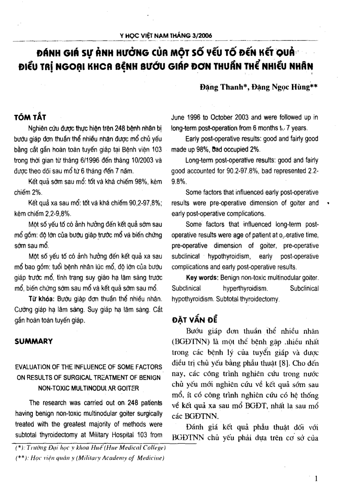 Nghiên cứu được thực hiện trên 248 bệnh nhân bị bướu giap đơn thuần thể nhiều nhân được mổ chủ yếu bằng cắt gần hoàn tuyến giáp tại bệnh viên 103 trong thời gian từ tháng 6/1996 đến tháng 10/2003 và được theo dõi sau mổ từ 6 tháng đến 7 năm. Kết quả sớm sau mổ: tốt và khá chiếm 98% , kém chiêm 2% . Kết quả xa sau mổ: tốt và khá chiếm 90,2 # 97,8% ; kém chiếm 2,2 # 9,8% . Một số yếu tố có ảnh hưởng đến kết quả sớm sau mổ gồm: độ lớn của bướu giáp trước mổ và biế chứng sớm sau mổ. Một số yếu tố có ảnh hưởng đến kết quả xa sau mổ bao gồm: lứa tuổi bệnh nhân lúc mổ, độ lớn của bướu giáp trước mổ, tình trạng suy giáp hạ lâm sàng trước mổ, biến chứng sớm sau mổ và kết quả sớm sau mổ.