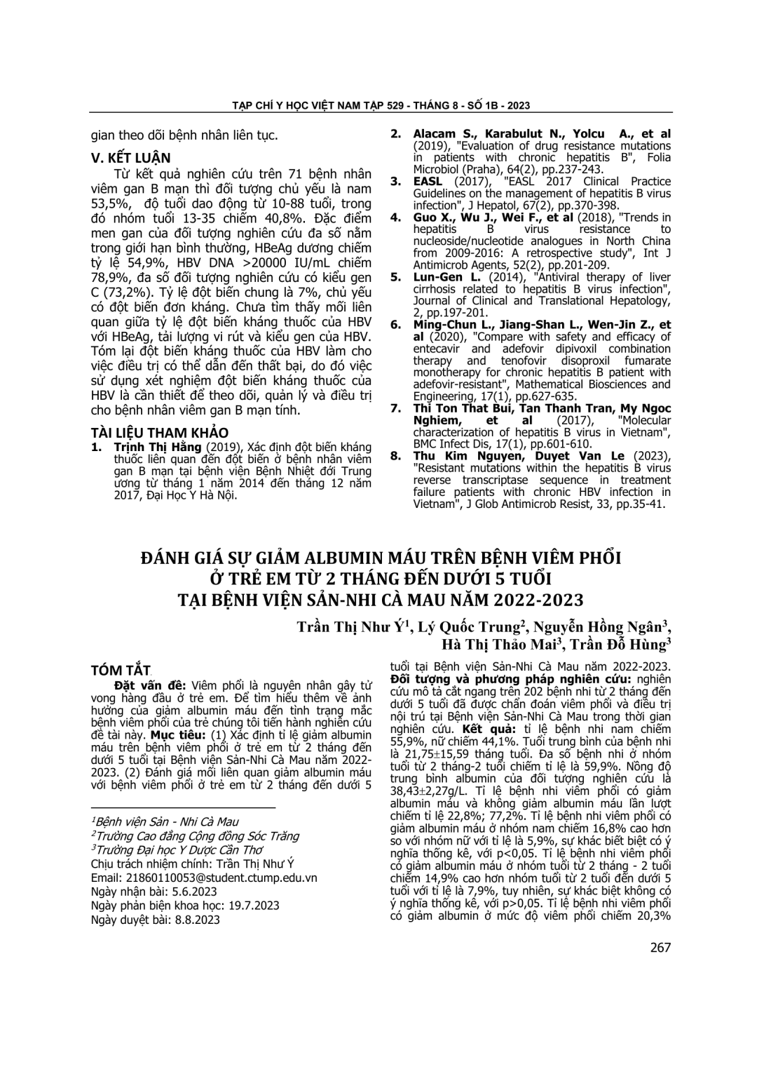 Xác định tỉ lệ giảm albumin máu trên bệnh viêm phổi ở trẻ em từ 2 tháng đến dưới 5 tuổi tại Bệnh viện Sản-Nhi Cà Mau năm 2022-2023. (2) Đánh giá mối liên quan giảm albumin máu với bệnh viêm phổi ở trẻ em từ 2 tháng đến dưới 5 tuổi tại Bệnh viện Sản-Nhi Cà Mau năm 2022-2023. Đối tượng và phương pháp nghiên cứu: nghiên cứu mô tả cắt ngang trên 202 bệnh nhi từ 2 tháng đến dưới 5 tuổi đã được chẩn đoán viêm phổi và điều trị nội trú tại Bệnh viện Sản-Nhi Cà Mau trong thời gian nghiên cứu. Kết quả: tỉ lệ bệnh nhi nam chiếm 55,9%, nữ chiếm 44,1%. Tuổi trung bình của bệnh nhi là 21,7515,59 tháng tuổi. Đa số bệnh nhi ở nhóm tuổi từ 2 tháng-2 tuổi chiếm tỉ lệ là 59,9%. Nồng độ trung bình albumin của đối tượng nghiên cứu là 38,432,27g/L. Tỉ lệ bệnh nhi viêm phổi có giảm albumin máu và không giảm albumin máu lần lượt chiếm tỉ lệ 22,8%; 77,2%. Tỉ lệ bệnh nhi viêm phổi có giảm albumin máu ở nhóm nam chiếm 16,8% cao hơn so với nhóm nữ với tỉ lệ là 5,9%, sự khác biết biệt có ý nghĩa thống kê, với p<0,05. Tỉ lệ bệnh nhi viêm phổi có giảm albumin máu ở nhóm tuổi từ 2 tháng - 2 tuổi chiếm 14,9% cao hơn nhóm tuổi từ 2 tuổi đến dưới 5 tuổi với tỉ lệ là 7,9%, tuy nhiên, sự khác biệt không có ý nghĩa thống kê, với p>0,05. Tỉ lệ bệnh nhi viêm phổi có giảm albumin ở mức độ viêm phổi chiếm 20,3% cao hơn bệnh nhi viêm phổi nặng (3%), với p>0,05. Nhóm bệnh nhi viêm phổi có giảm albumin máu được sử dụng ≥2 loại kháng sinh chiếm tỉ lệ là 2,5% thấp hơn tỉ lệ bệnh nhi viêm phổi có giảm albumin sử dụng 1 loại kháng sinh là 4%, sự khác biệt không có ý nghĩ thống kê với p>0,05. Kết luận: Giảm albumin ở trẻ em viêm phổi có sự liên quan với giới tính, tỉ lệ bé nam viêm phổi có giảm albumin máu cao hơn nữ. Giảm albumin trên bệnh nhân viêm phổi không là yếu tố liên quan với mức độ nặng cũng như tăng số lượng kháng sinh sử dụng trong viêm phổi.