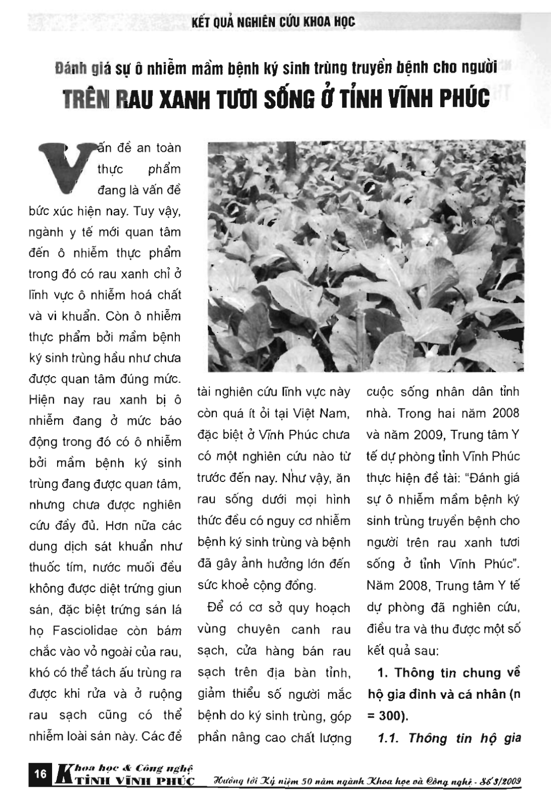 Đánh giá sự ô nhiễm mầm bệnh ký sinh trùng truyền bệnh cho người trên rau xanh tươi sống ở tỉnh Vĩnh Phúc.