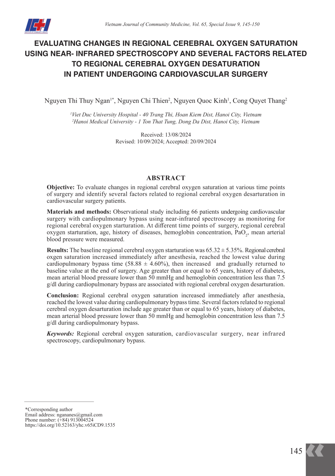 Đánh giá sự thay đổi bão hòa oxy vùng của não tại một số thời điểm trong phẫu thuật và xác định một số yếu tố liên quan đến tụt bão hòa oxy vùng của não ở bệnh nhân phẫu thuật tim mạch có chạy tuần hoàn ngoài cơ thể. Đối tượng, phương pháp nghiên cứu: Nghiên cứu quan sát trên 66 bệnh nhân phẫu thuật tim mạch được theo dõi bão hòa oxy vùng của não bằng quang phổ cận hồng ngoại. Giá trị bão hòa oxy vùng của não, tuổi bệnh nhân, bệnh lý đi kèm, hemoglobin, PaO2, huyết áp trung bình được ghi lại tại các thời điểm phẫu thuật. Kết quả: Giá trị bão hòa oxy vùng của não nền của bệnh nhân phẫu thuật tim mạch là 65,32 ± 5,35%, bão hòa oxy vùng của não tăng lên ngay sau khi gây mê, đạt giá trị thấp nhất trong giai đoạn chạy tuần hoàn ngoài cơ thể (58,88 ± 4,60%) và dần trở về giá trị nền ở thời điểm kết thúc phẫu thuật. Tuổi ≥ 65, tiền sử đái tháo đường, huyết áp trung bình duới 50 mmHg và nồng độ hemoglobin dưới 7,5 g/dl trong tuần hoàn ngoài cơ thể có liên quan tới kết cục tụt bão hòa oxy vùng của não.Kết luận: Bão hòa oxy vùng của não tăng lên ngay sau khi gây mê, giảm thấp nhất trong giai đoạn chạy tuần hoàn ngoài cơ thể. Tuổi ≥ 65, tiền sử đái tháo đường, huyết áp trung bình duới 50 mmHg và hemoglobin dưới 7,5 g/dl có liên quan tới kết cục tụt bão hòa oxy vùng của não.