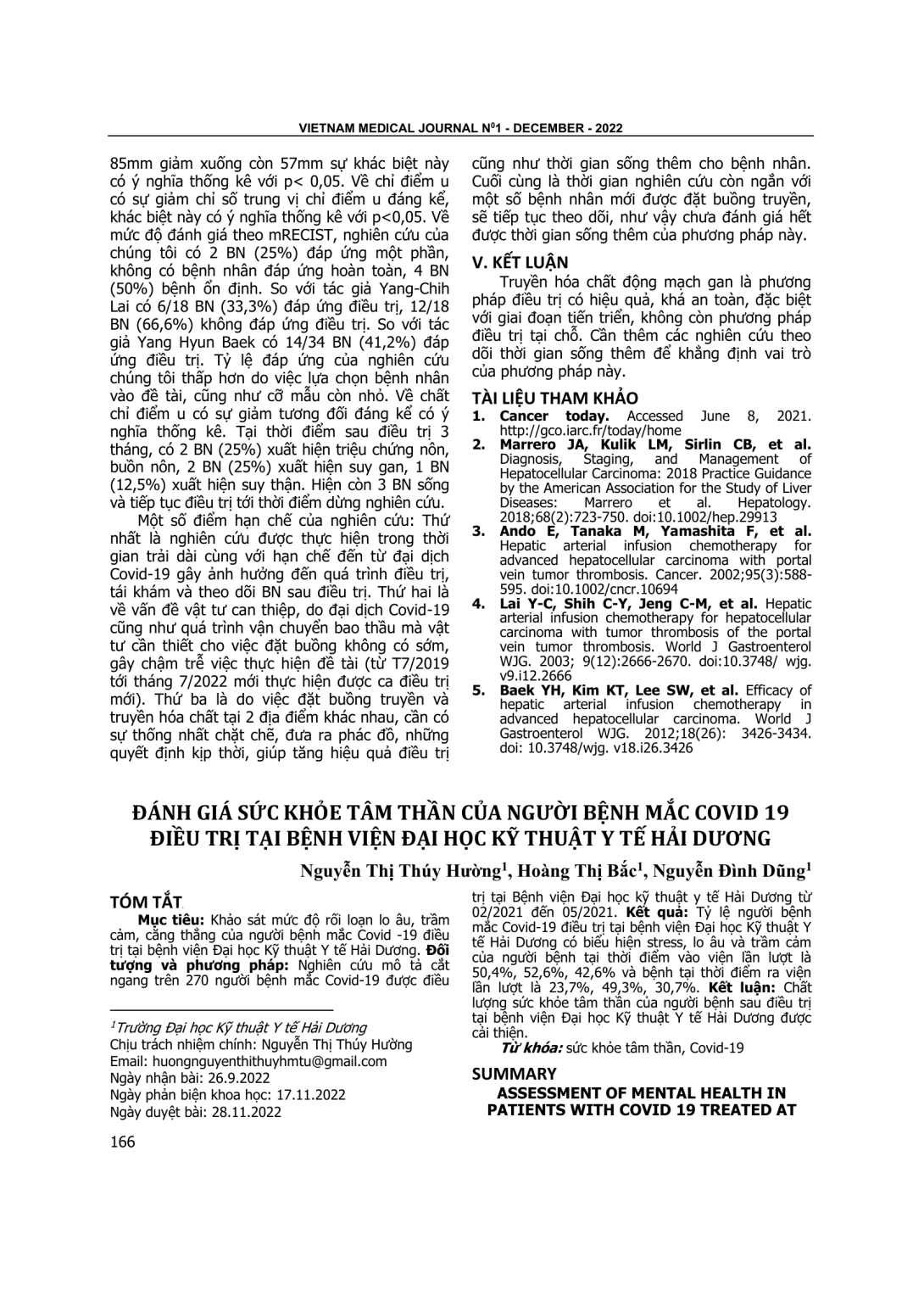 Khảo sát mức độ rối loạn lo âu, trầm cảm, căng thẳng của người bệnh mắc Covid -19 điều trị tại bệnh viện Đại học Kỹ thuật Y tế Hải Dương. Đối tượng và phương pháp: Nghiên cứu mô tả cắt ngang trên 270 người bệnh mắc Covid-19 được điều trị tại Bệnh viện Đại học kỹ thuật y tế Hải Dương từ 02/2021 đến 05/2021. Kết quả: Tỷ lệ người bệnh mắc Covid-19 điều trị tại bệnh viện Đại học Kỹ thuật Y tế Hải Dương có biểu hiện stress, lo âu và trầm cảm của người bệnh tại thời điểm vào viện lần lượt là 50,4%, 52,6%, 42,6% và bệnh tại thời điểm ra viện lần lượt là 23,7%, 49,3%, 30,7%. Kết luận: Chất lượng sức khỏe tâm thần của người bệnh sau điều trị tại bệnh viện Đại học Kỹ thuật Y tế Hải Dương được cải thiện.