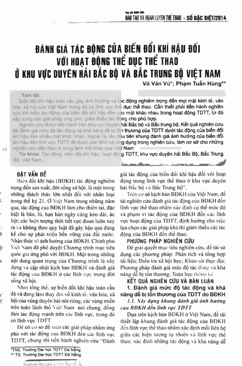 Đánh giá tác động của biến đổi khí hậu đối với hoạt động thể dục thể thao ở khu vực duyên hải Bắc Bộ và Bắc Trung Bộ Việt Nam