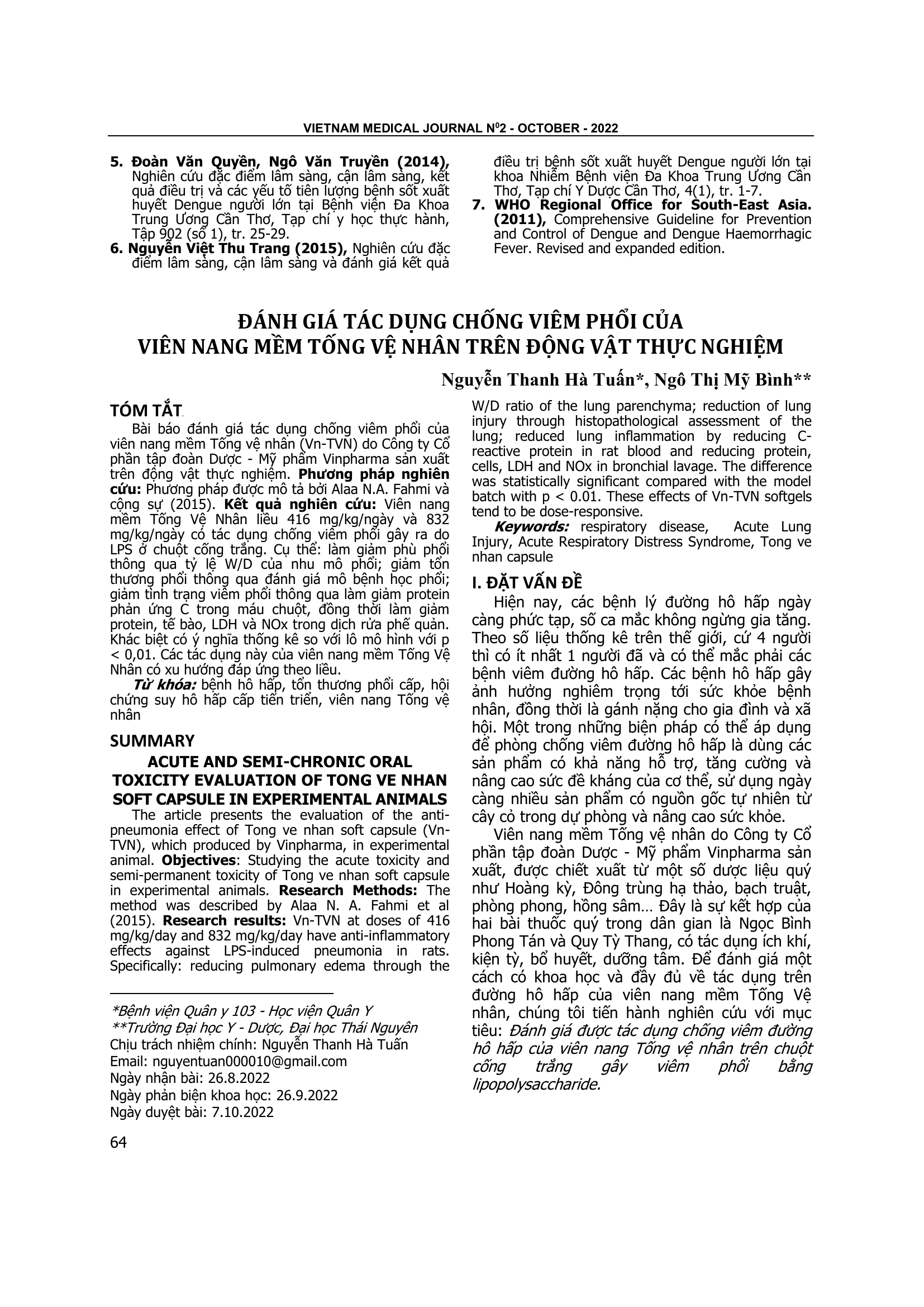 Đánh giá tác dụng chống viêm phổi của viên nang mềm Tống vệ nhân (Vn-TVN) do Công ty Cổ phần tập đoàn Dược - Mỹ phẩm Vinpharma sản xuất trên động vật thực nghiệm. Phương pháp nghiên cứu: Phương pháp được mô tả bởi Alaa N.A. Fahmi và cộng sự (2015). Kết quả nghiên cứu: Viên nang mềm Tống Vệ Nhân liều 416 mg/kg/ngày và 832 mg/kg/ngày có tác dụng chống viêm phổi gây ra do LPS ở chuột cống trắng. Cụ thể: làm giảm phù phổi thông qua tỷ lệ W/D của nhu mô phổi; giảm tổn thương phổi thông qua đánh giá mô bệnh học phổi; giảm tình trạng viêm phổi thông qua làm giảm protein phản ứng C trong máu chuột, đồng thời làm giảm protein, tế bào, LDH và NOx trong dịch rửa phế quản. Khác biệt có ý nghĩa thống kê so với lô mô hình với p < 0,01. Các tác dụng này của viên nang mềm Tống Vệ Nhân có xu hướng đáp ứng theo liều.