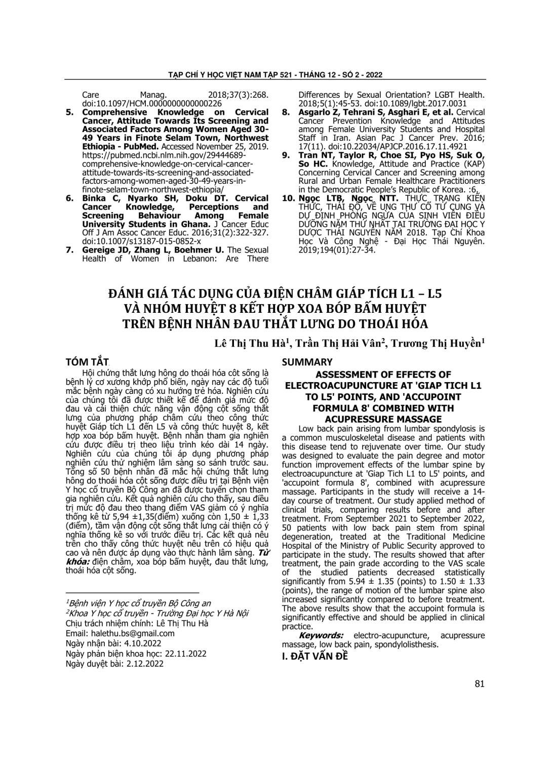 Hội chứng thắt lưng hông do thoái hóa côt sống là bệnh lý cơ xương khớp phổ biến, ngày nay các độ tuổi mắc bệnh ngày càng có xu hướng trẻ hóa. Nghiên cứu của chúng tôi đã được thiết kế để đánh giá mức độ đau và cải thiện chức năng vận động cột sống thắt lưng của phương pháp châm cứu theo công thức huyệt Giáp tích L1 đến L5 và công thức huyệt 8, kết hợp xoa bóp bấm huyệt. Bệnh nhân tham gia nghiên cứu được điều trị theo liệu trình kéo dài 14 ngày. Nghiên cứu của chúng tôi áp dụng phương pháp nghiên cứu thử nghiệm lâm sàng so sánh trước sau. Tổng số 50 bệnh nhân đã mắc hội chứng thắt lưng hông do thoái hóa cột sống được điều trị tại Bệnh viện Y học cổ truyền Bộ Công an đã được tuyển chọn tham gia nghiên cứu. Kết quả nghiên cứu cho thấy, sau điều trị mức độ đau theo thang điểm VAS giảm có ý nghĩa thống kê từ 5,94 ±1,35(điểm) xuống còn 1,50 ± 1,33 (điểm), tầm vận động cột sống thắt lưng cải thiện có ý nghĩa thống kê so với trước điều trị. Các kết quả nêu trên cho thấy công thức huyệt nêu trên có hiệu quả cao và nên được áp dụng vào thực hành lâm sàng.