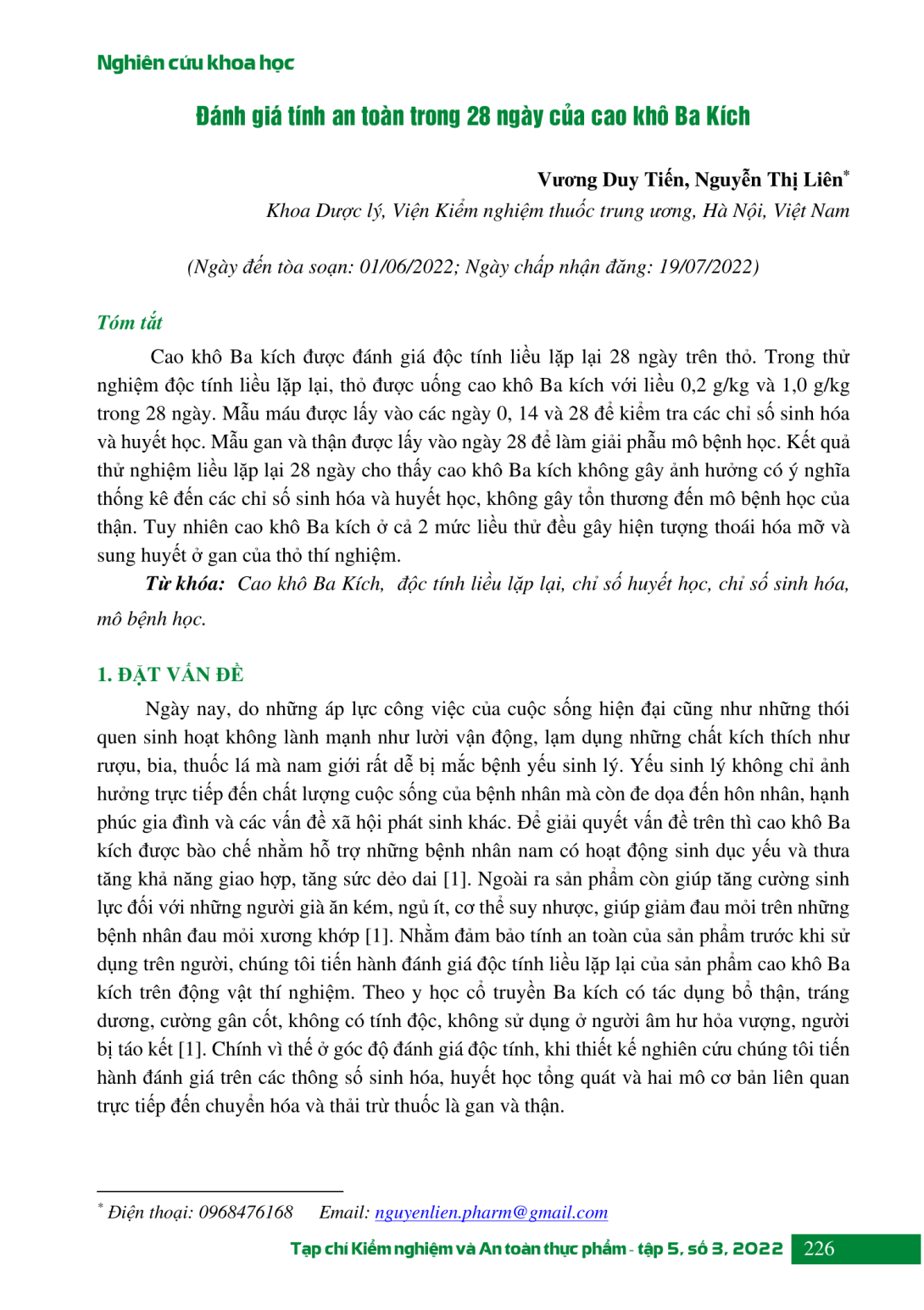 The “Ba kich” (Extractum Morinda ofcinalis) dried extract was evaluated for repeated dose toxicity at 28 days in rabbits. In a repeat dose toxicity test, rabbits were given oral solution of dry extract of Ba kich at the level of 0.2 g/kg and 1.0 g/kg for 28 days. Blood samples were taken on days 0, 14 and 28 to check biochemical and hematological parameters. Liver and kidney samples were obtained on day 28 for histopathology. The results of the 28-day repeated dose toxicity assessment showed that the dried Ba kich extract did not have a statistically significant effect on the biochemical and hematological indices, and did not cause damage to the histopathology of the kidney. However, dried Ba kich extract at both dose levels caused fatty degeneration and congestion in the liver of experimental rabbits.