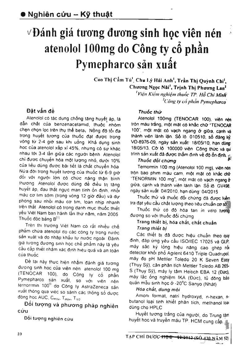 Đánh giá tương đương sinh học viên nén atenolol 100mg do ACAông ty cổ phần Pymepharcosanr xuất